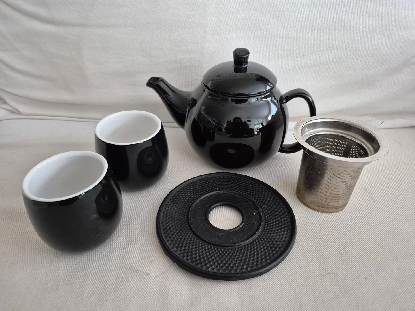 This set includes a shiny black teapot, two matching cups, a metal tea infuser, and a cast iron trivet. It's perfect for enjoying a relaxing cup of tea. The teapot is made of ceramic and features a smooth, glossy finish.