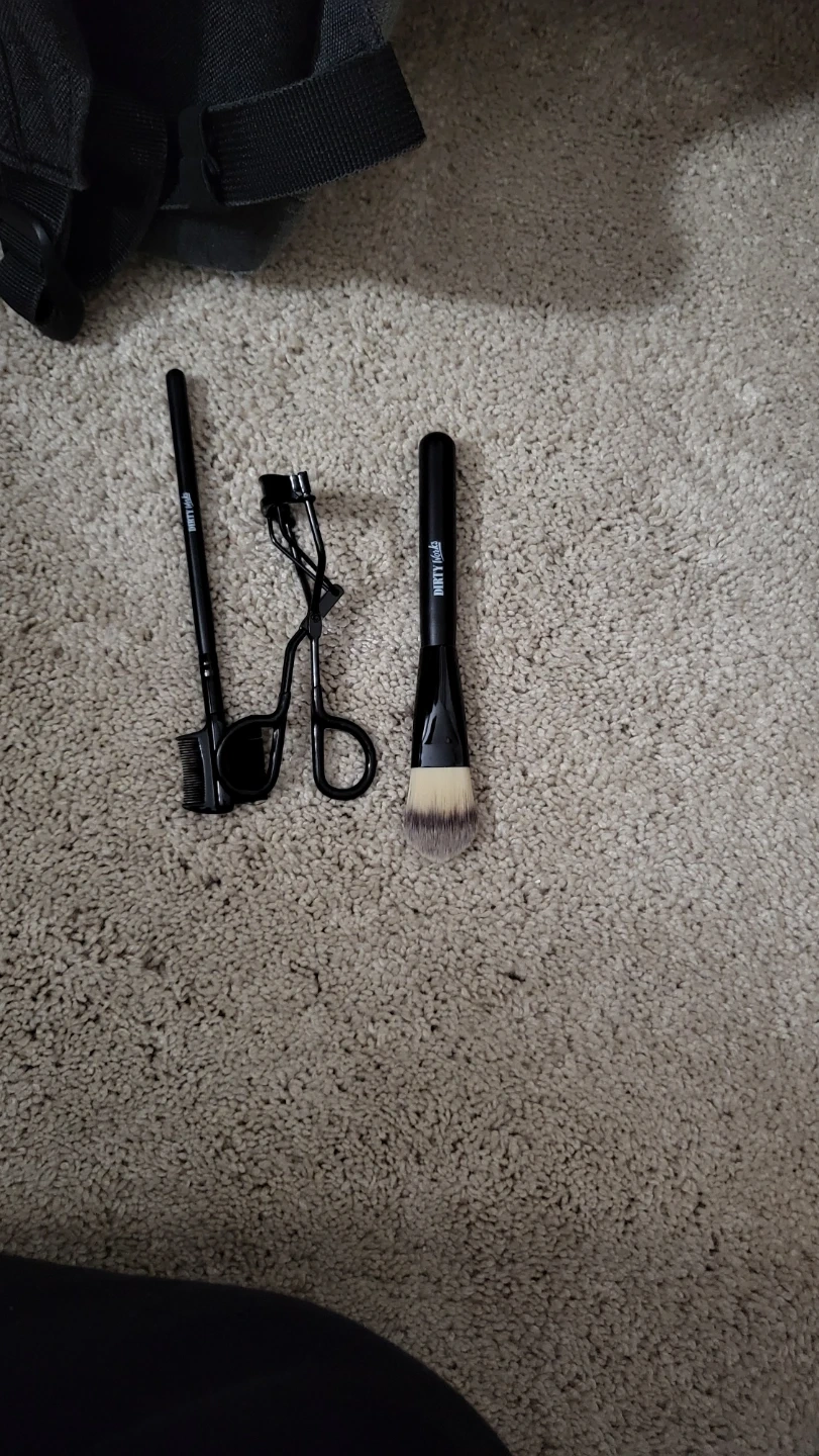 This set includes a Dirty Works foundation brush and a lash comb with curler. The brush has synthetic bristles. It's a nice addition for any makeup routine!