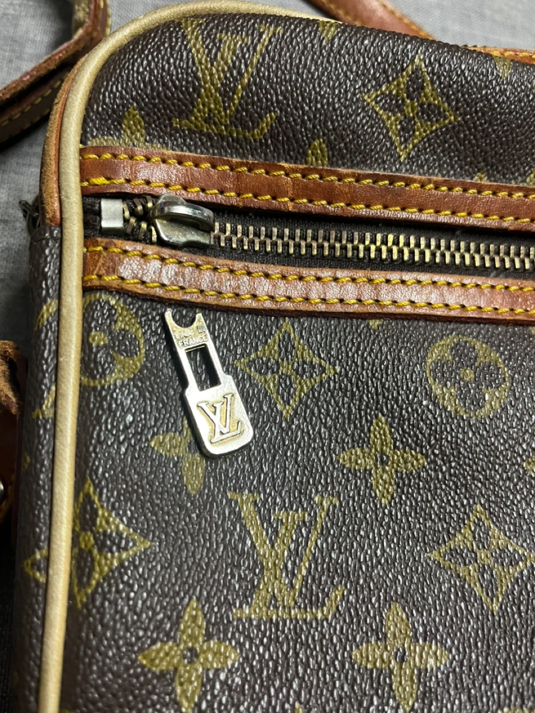 This Louis Vuitton crossbody bag features the iconic monogram canvas with leather trim. It has a zippered main compartment and an additional front zippered pocket for easy access. Bag's interior is lined with dark fabric.