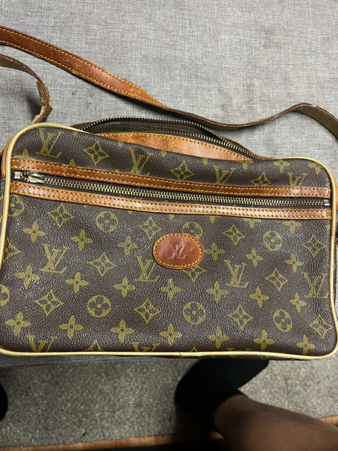 Crossbody strap on left side is ripped.