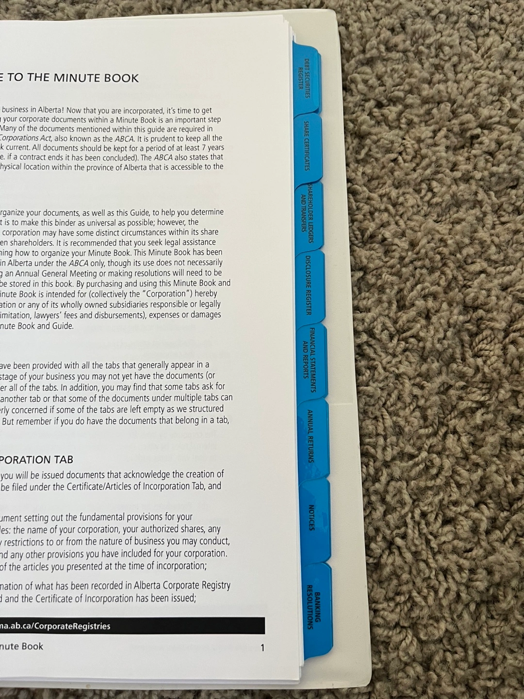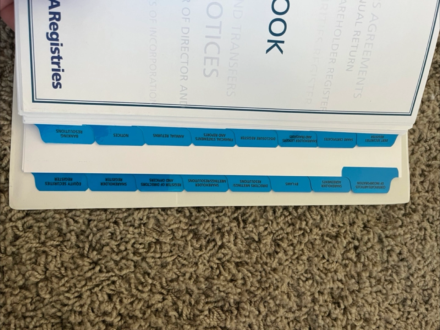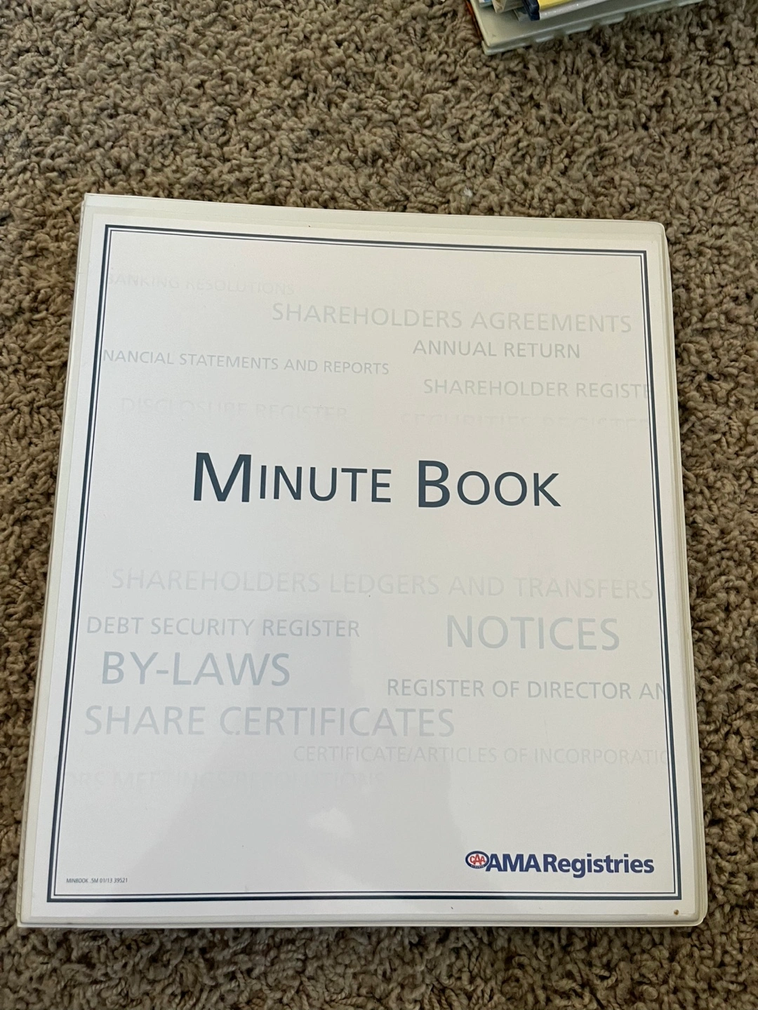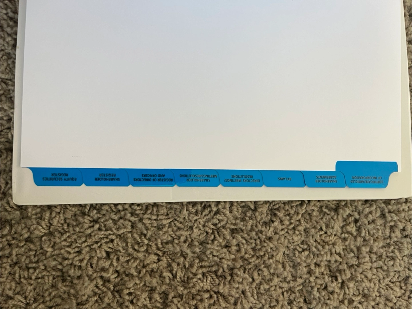 Minute book with many colourful tabs. Includes several sections. You can use it to keep everything organized and easy to find, so you can stay focused and at peace. Paid $35 in Staples