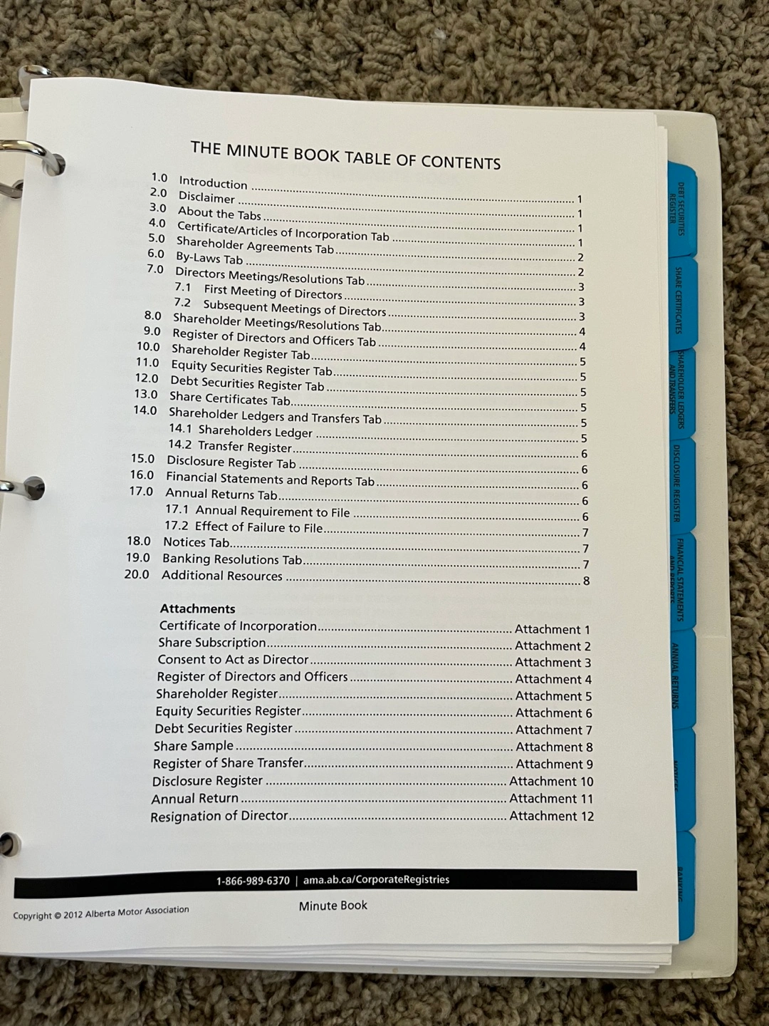 Minute book with many colourful tabs. Includes several sections. You can use it to keep everything organized and easy to find, so you can stay focused and at peace. Paid $35 in Staples