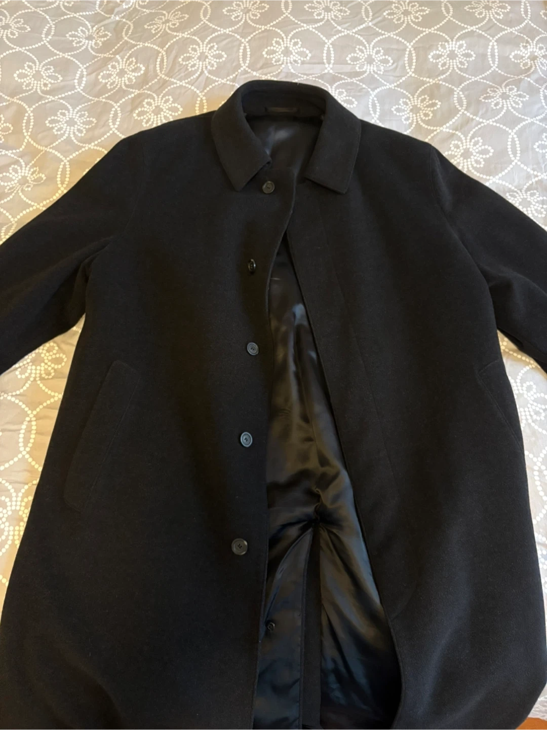 Selling a classic black wool coat. It's in great condition and perfect for the colder weather! The coat features a button-up closure and a sleek, timeless design and oversized fit