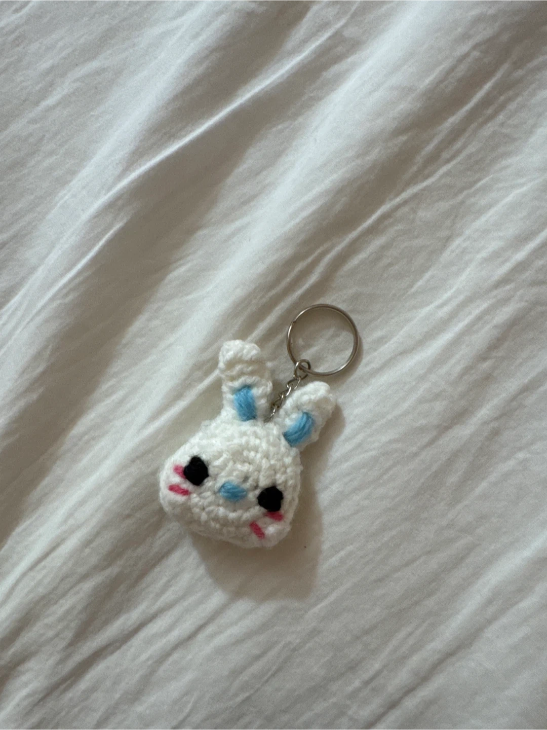 This is a cute, handmade crochet keychain featuring a little newjeans bunny with blue ears and pink cheeks. It's a fun accessory for your keys or bag! Made from soft yarn.