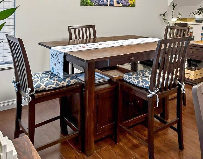 Stylish dark wood counter height dining set from Urban Barn. Includes one table and four matching chairs. Blue and white patterned cushions are included. The table has cabinet storage underneath and is expandable. A matching console table is also available.