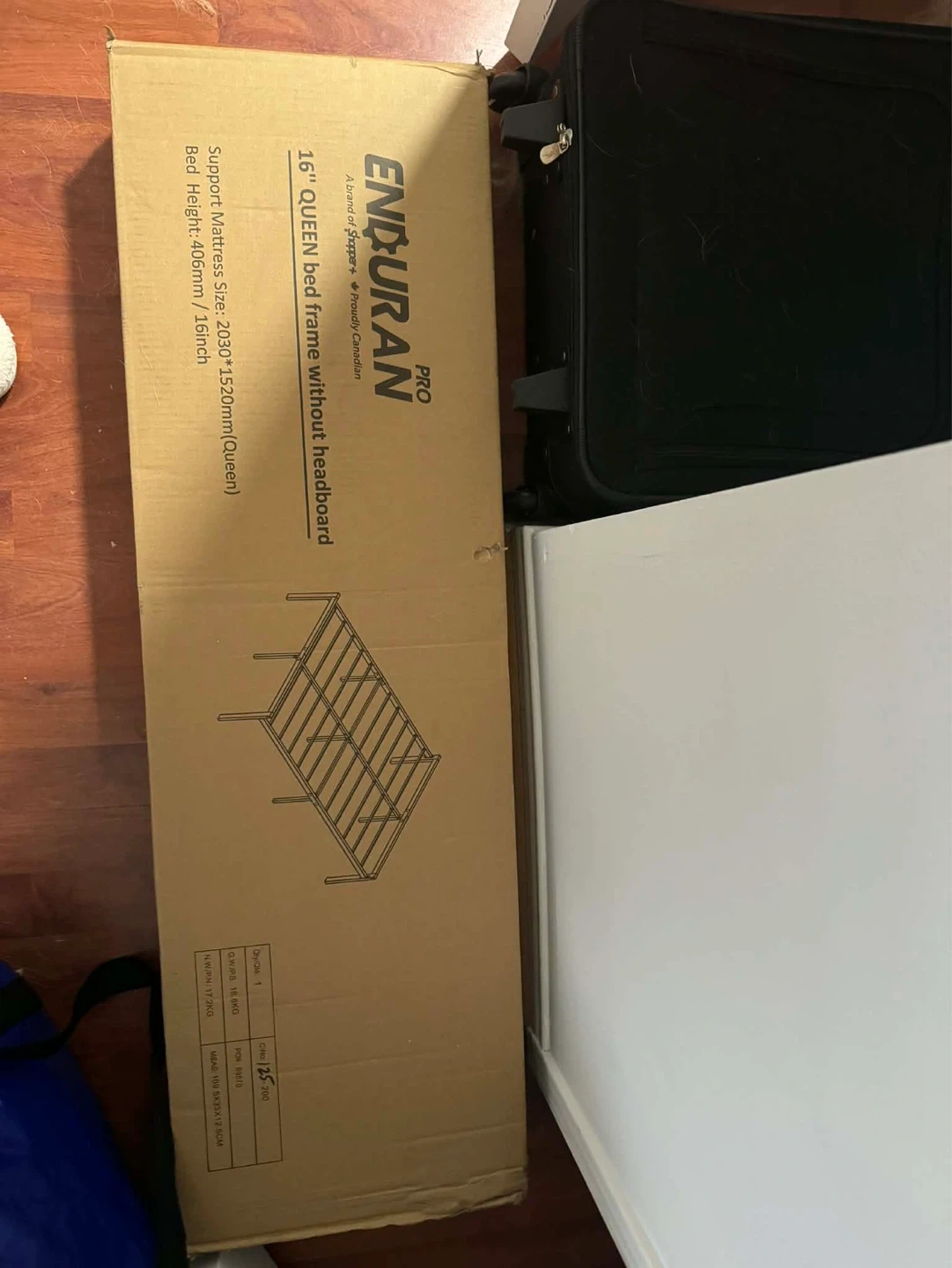 ENDURAN PRO queen bed frame without headboard. Supports mattress size 2030*1520mm (Queen). Bed height is 406mm/16 inches. Comes in original packaging, unopened