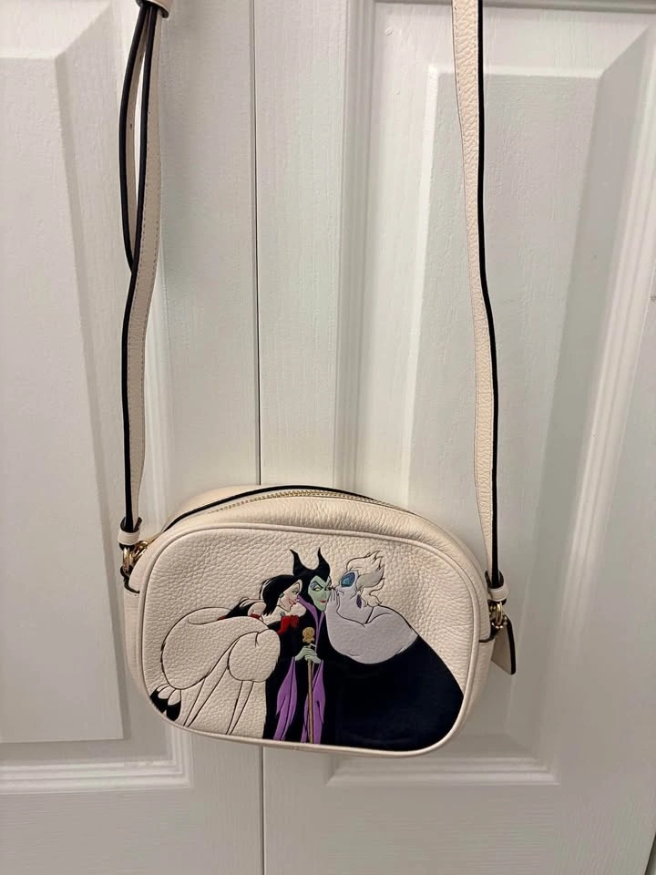 Authentic Coach Disney Villains crossbody bag in cream. Features a cool graphic of Cruella de Vil, Maleficent, and Ursula. Gold tone hardware and zipper closure. Adjustable strap. Inside has a tag with the serial number G2281-CC119. Great for any Disney fan!