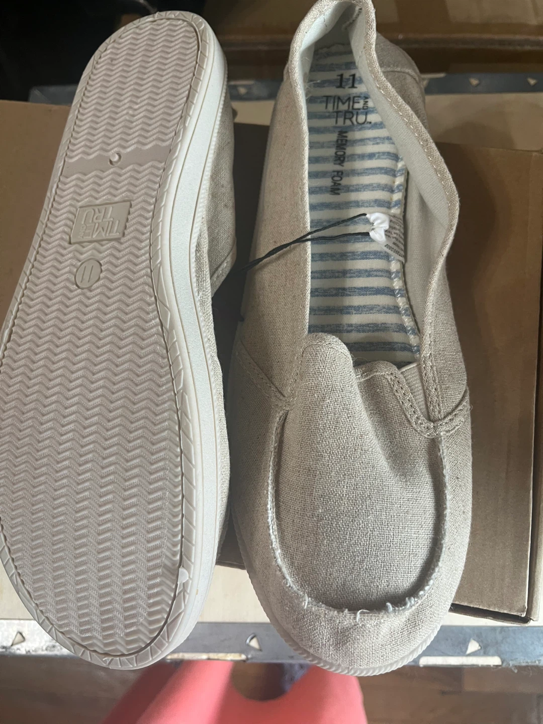 These tan loafers from Time and Tru feature a comfortable memory foam insole. They're a women's size 11 slip-on style. Linen-like fabric. Never worn.