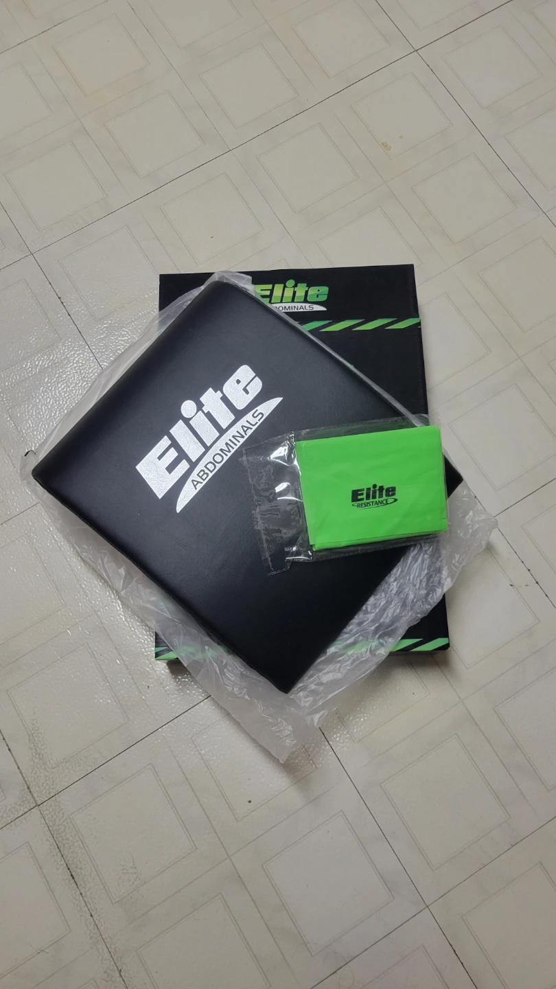 This Elite Abdominals core trainer is designed for effective ab workouts. It comes with a green Elite resistance band for added exercises. The set includes the ab trainer, the resistance band, and the original box.