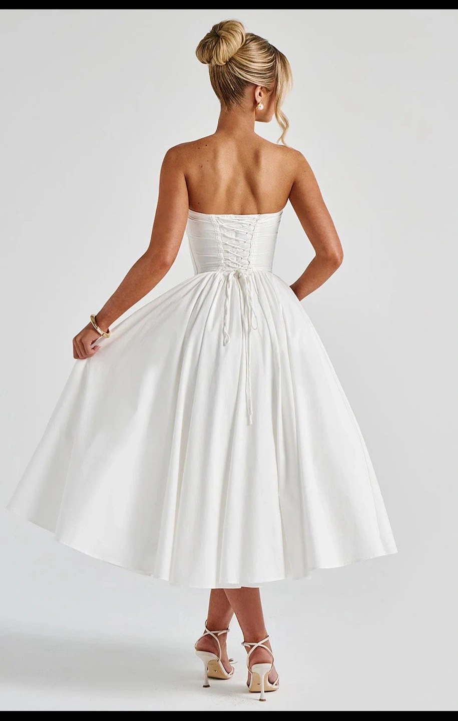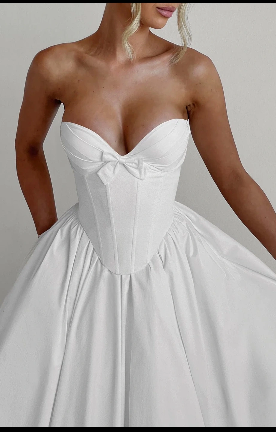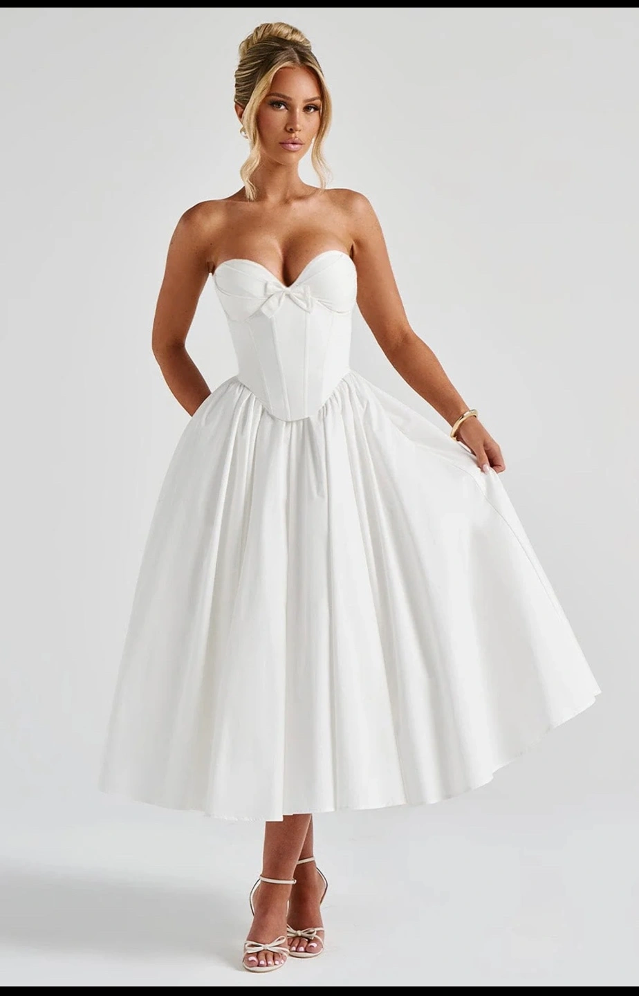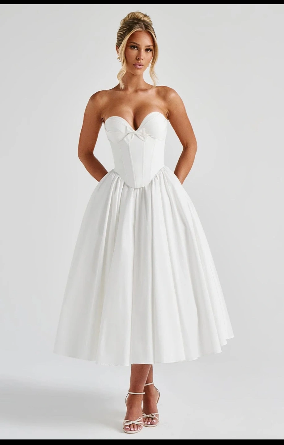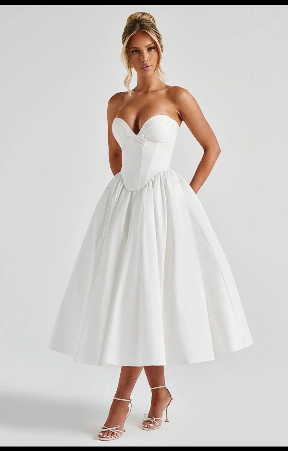 The Prim Midi Dress in ivory is a stunning blend of sophistication and allure, perfect for making a statement at any special occasion. This strapless design features a plunging sweetheart neckline that beautifully frames the décolletage, accented by a decorative bow between the cups for a charming touch. The boned corset overlay and underwired pleated cups deliver support and structure, ensuring a flattering fit. The romantic lace-up back allows for an adjustable finish, while the gathered full skirt flows gracefully from the waist, creating a timeless and effortlessly chic look.