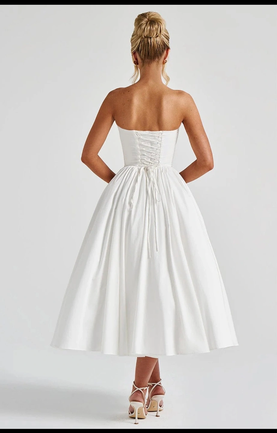 Strapless sweetheart neckline. Corset bodice with a bow detail. Full tea-length skirt. Back zipper and lace-up closure. Beautiful for a wedding or special event.