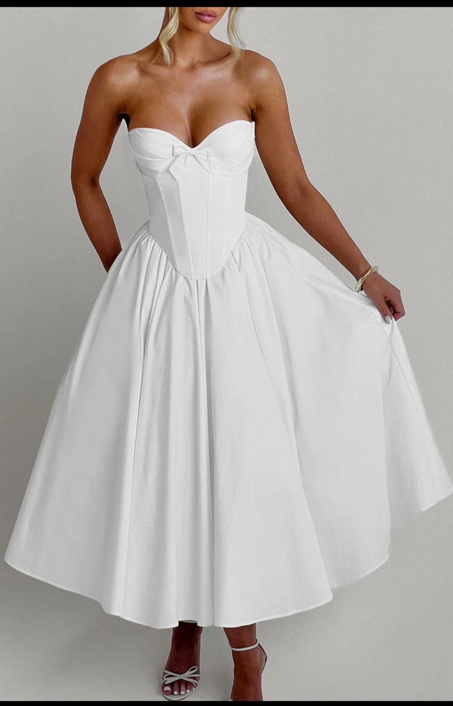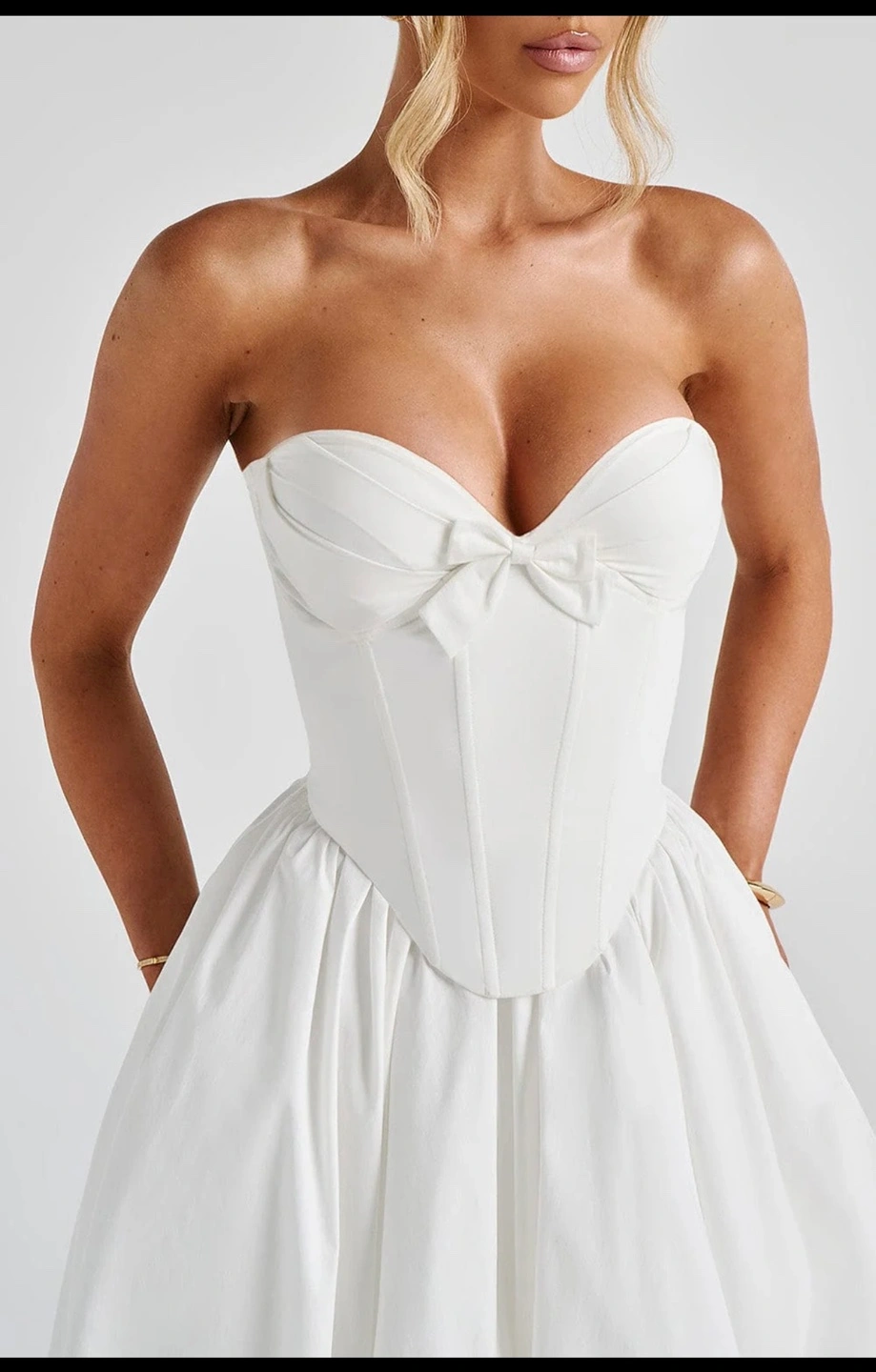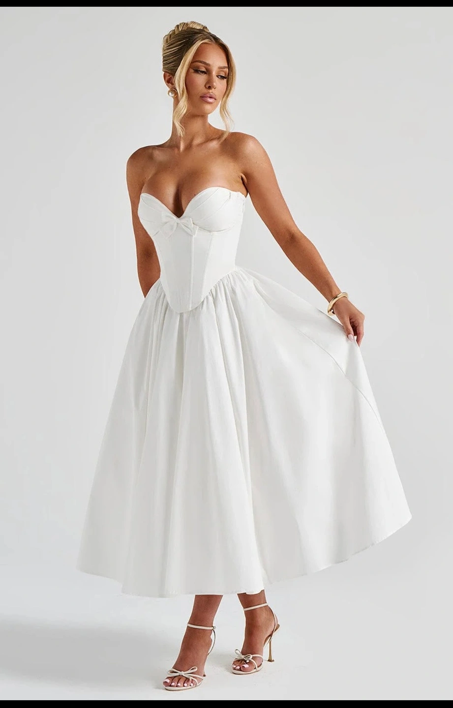 The Prim Midi Dress in ivory is a stunning blend of sophistication and allure, perfect for making a statement at any special occasion. This strapless design features a plunging sweetheart neckline that beautifully frames the décolletage, accented by a decorative bow between the cups for a charming touch. The boned corset overlay and underwired pleated cups deliver support and structure, ensuring a flattering fit. The romantic lace-up back allows for an adjustable finish, while the gathered full skirt flows gracefully from the waist, creating a timeless and effortlessly chic look.