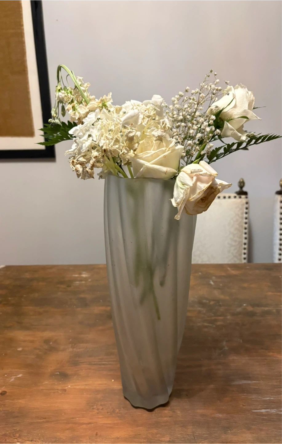 This is a frosted glass vase with a distinctive swirl pattern. It's perfect for displaying bouquets of flowers. The frosted finish adds a touch of elegance to any room. Quite large.