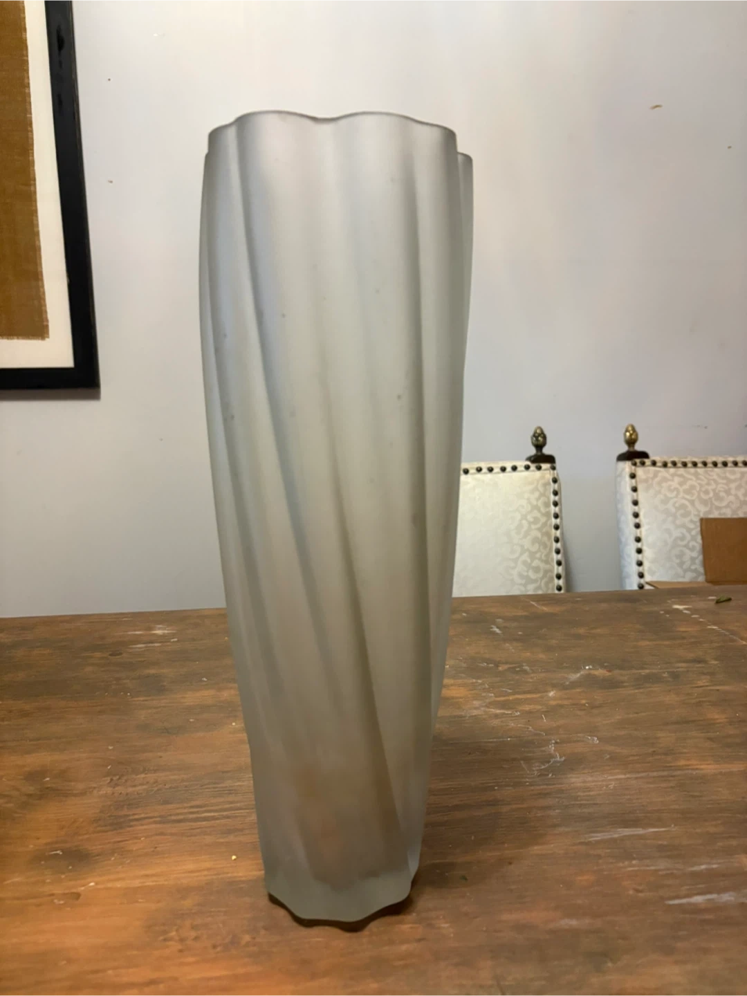This is a frosted glass vase with a distinctive swirl pattern. It's perfect for displaying bouquets of flowers. The frosted finish adds a touch of elegance to any room. Quite large.