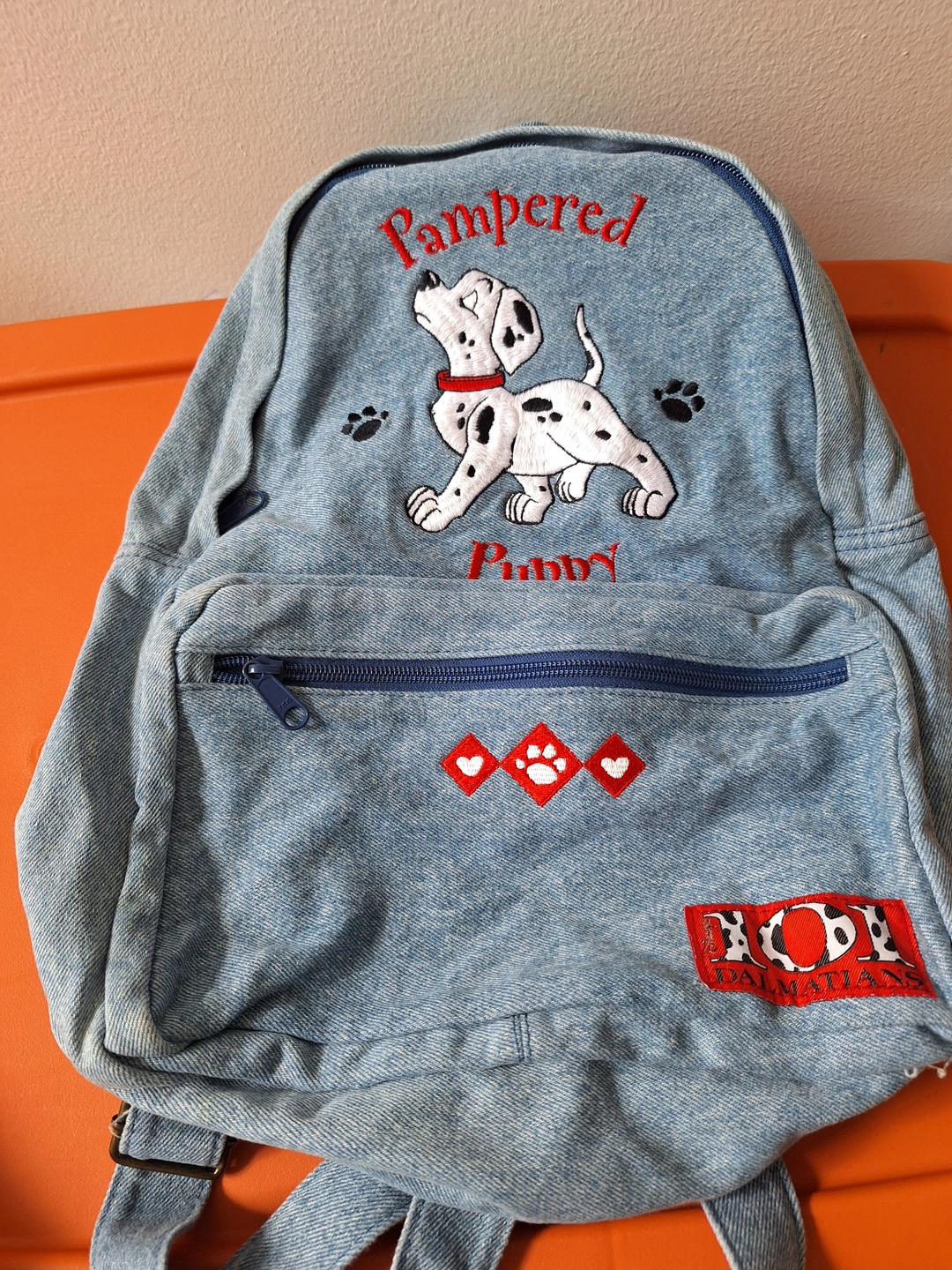 This adorable denim backpack features a cute Dalmatian puppy design. It's from The Disney Store and has a front zipper pocket. Perfect for any Disney or dog lover!
