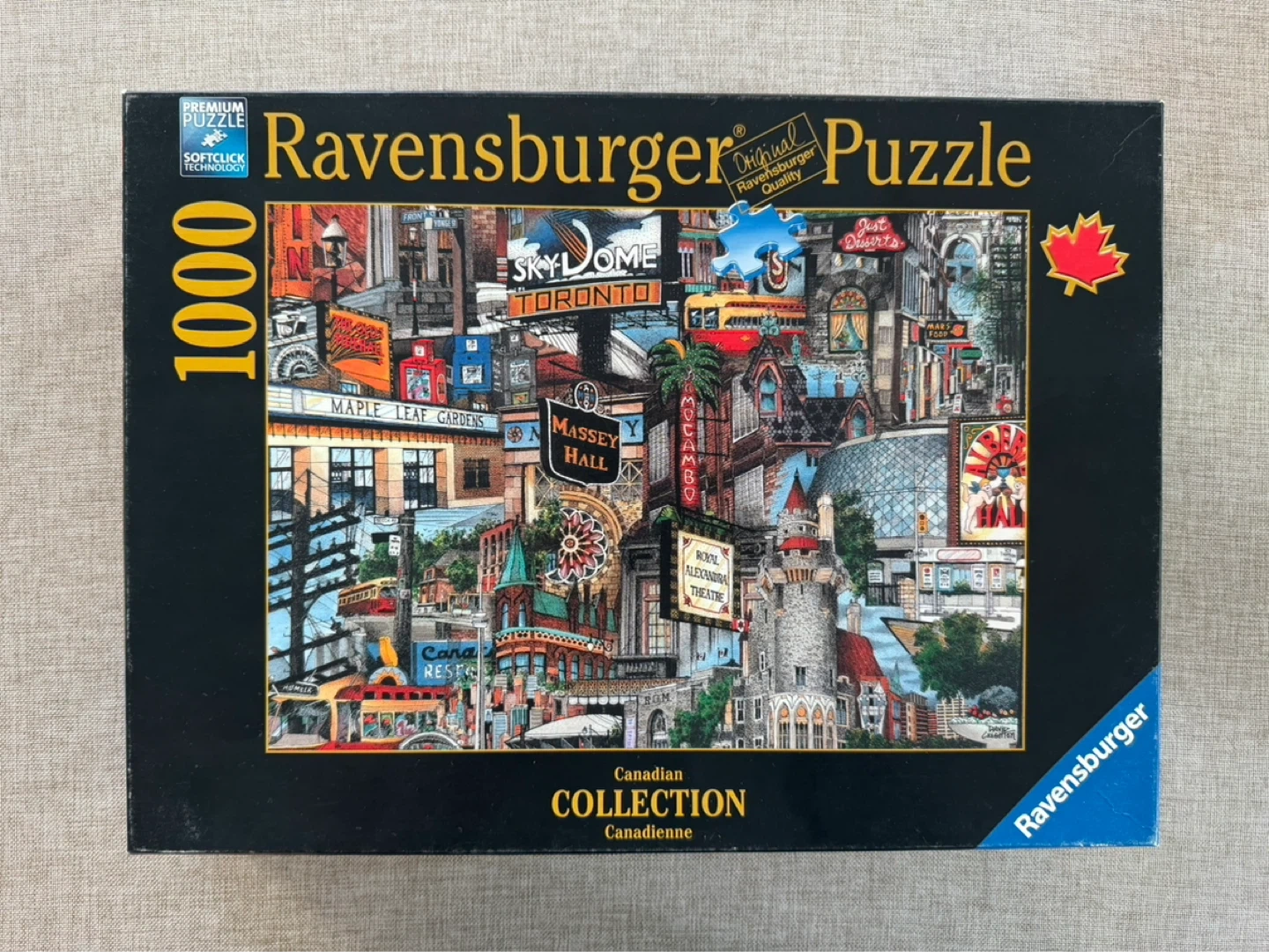 Collectors Ravensburger 1000 piece puzzle featuring a Canadian Collection collage. Hard to find! It has Softclick Technology for a perfect interlocking fit. This puzzle depicts iconic Toronto landmarks.