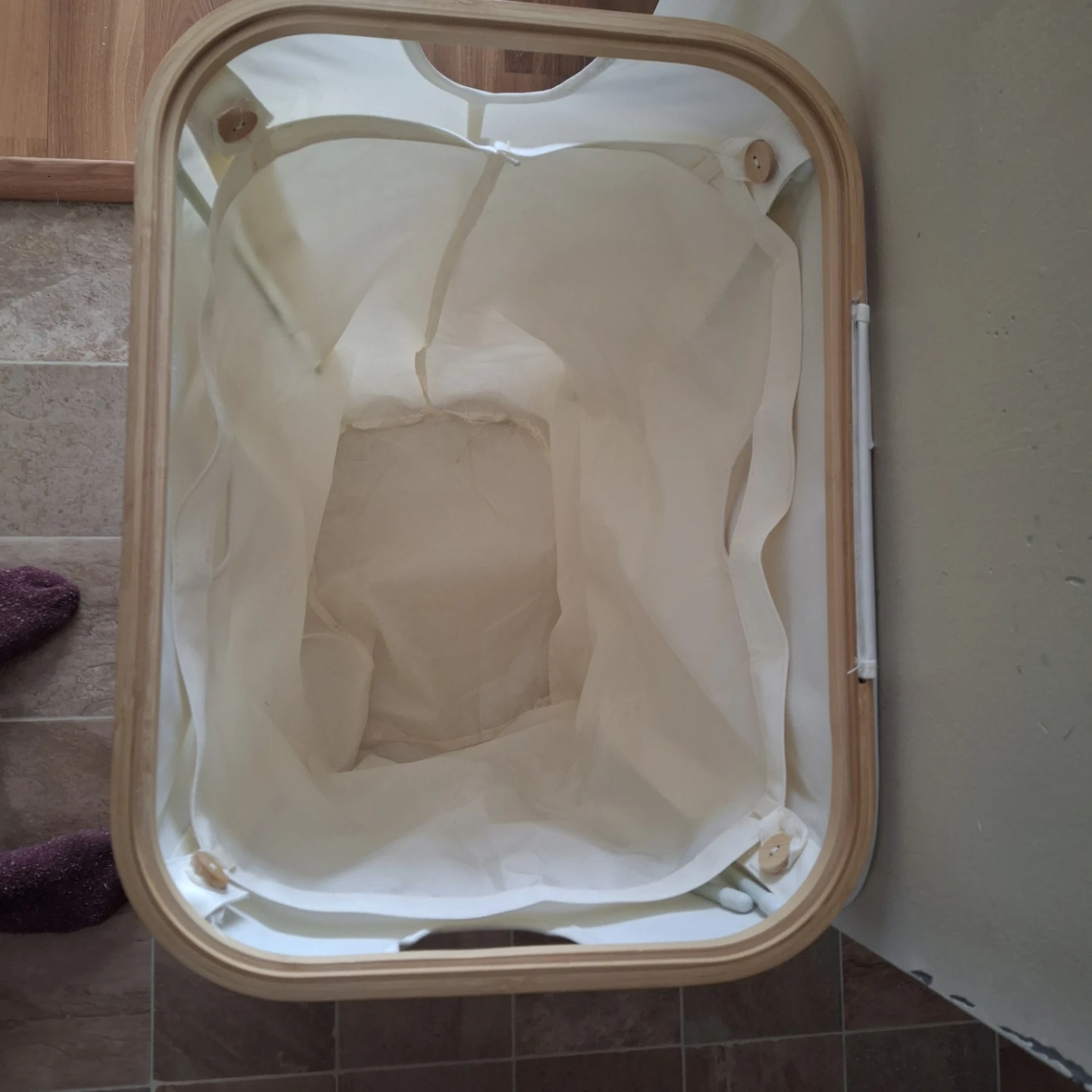 This laundry hamper is made with a white fabric and a bamboo frame. It's designed for easy storage and transport of your laundry. The hamper comes with a lid to keep contents contained.