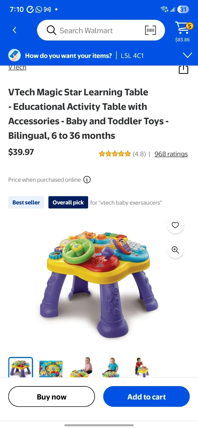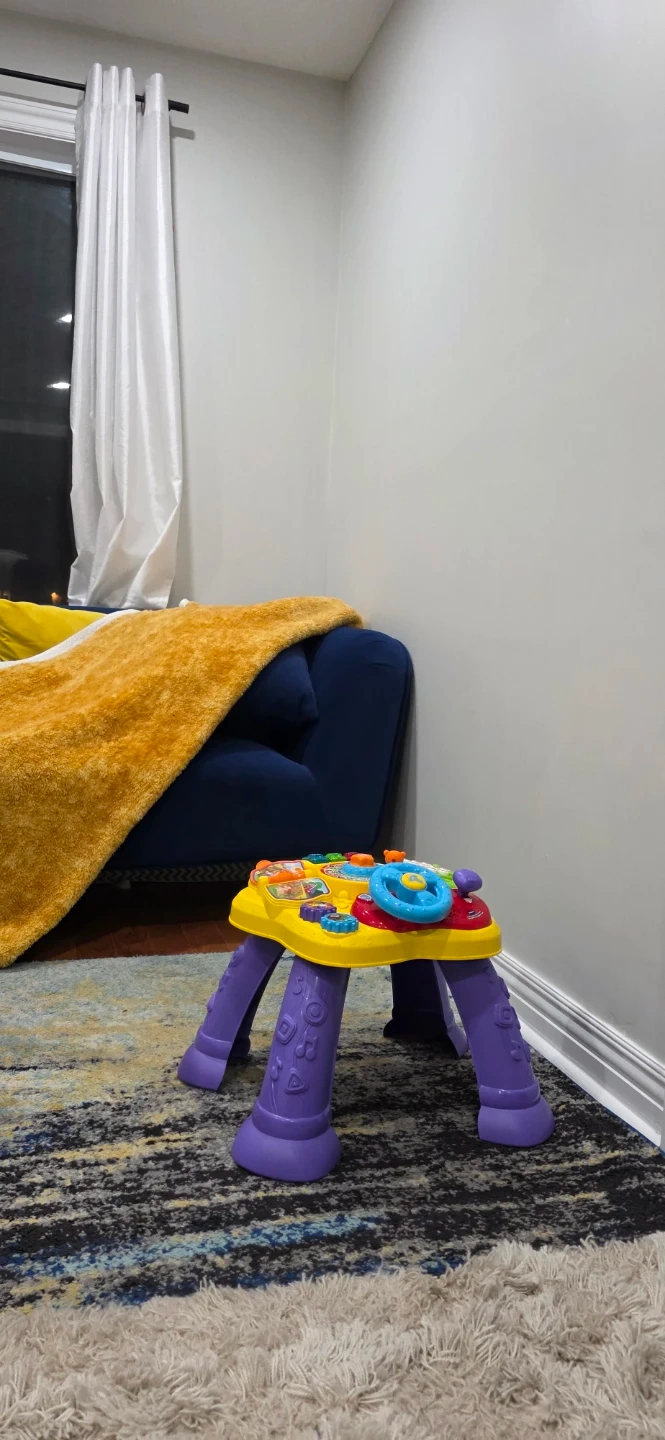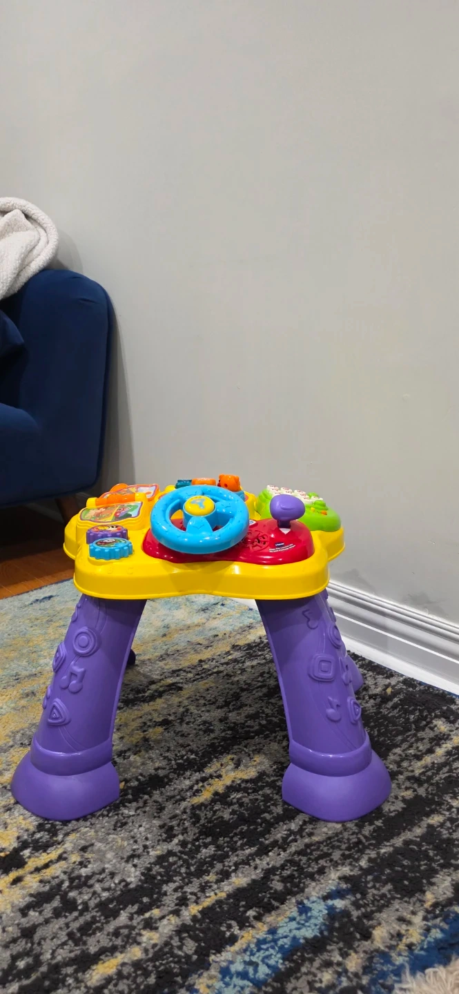 This VTech Magic Star Learning Table is an educational activity table thay helps kids start Standing. It's bilingual and suitable for babies and toddlers aged 6 to 36 months. It includes various interactive toys and sounds.
