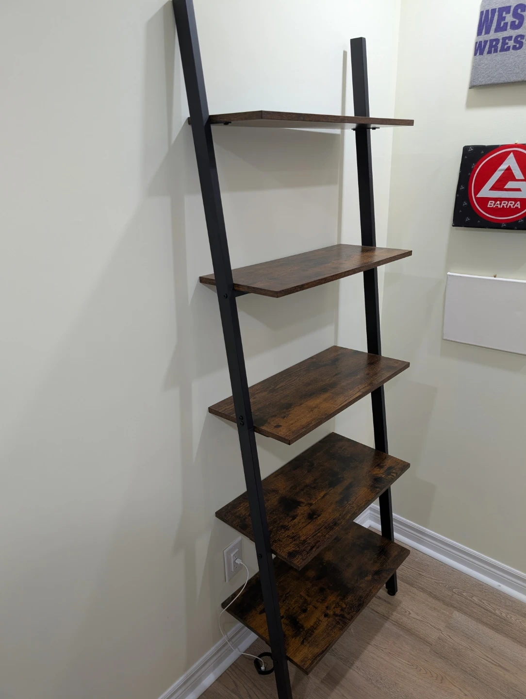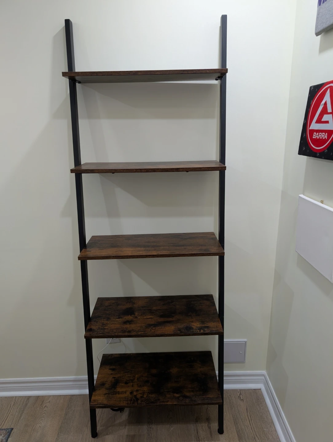 Selling a ladder shelf with five tiers! It's in great shape and ready to hold your books, plants, or other decorative items. The dark wood finish and black metal frame give it a modern, industrial look that would fit in any room