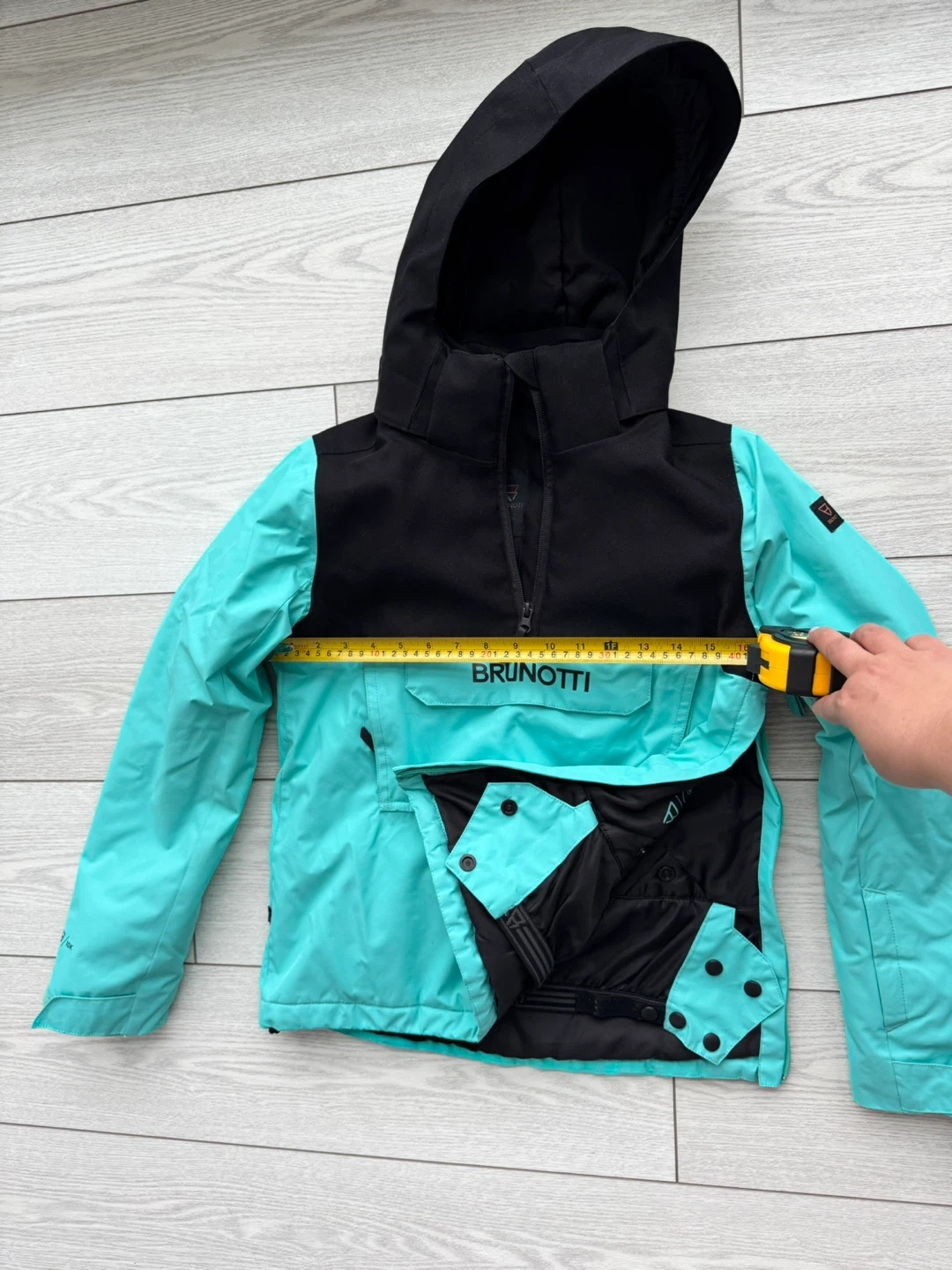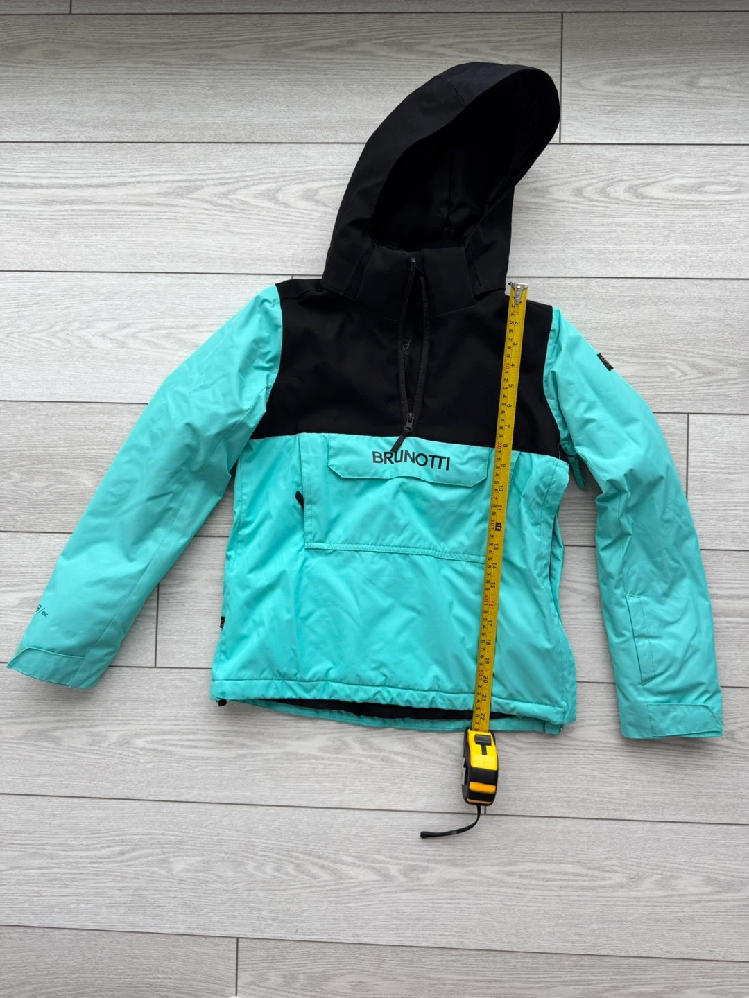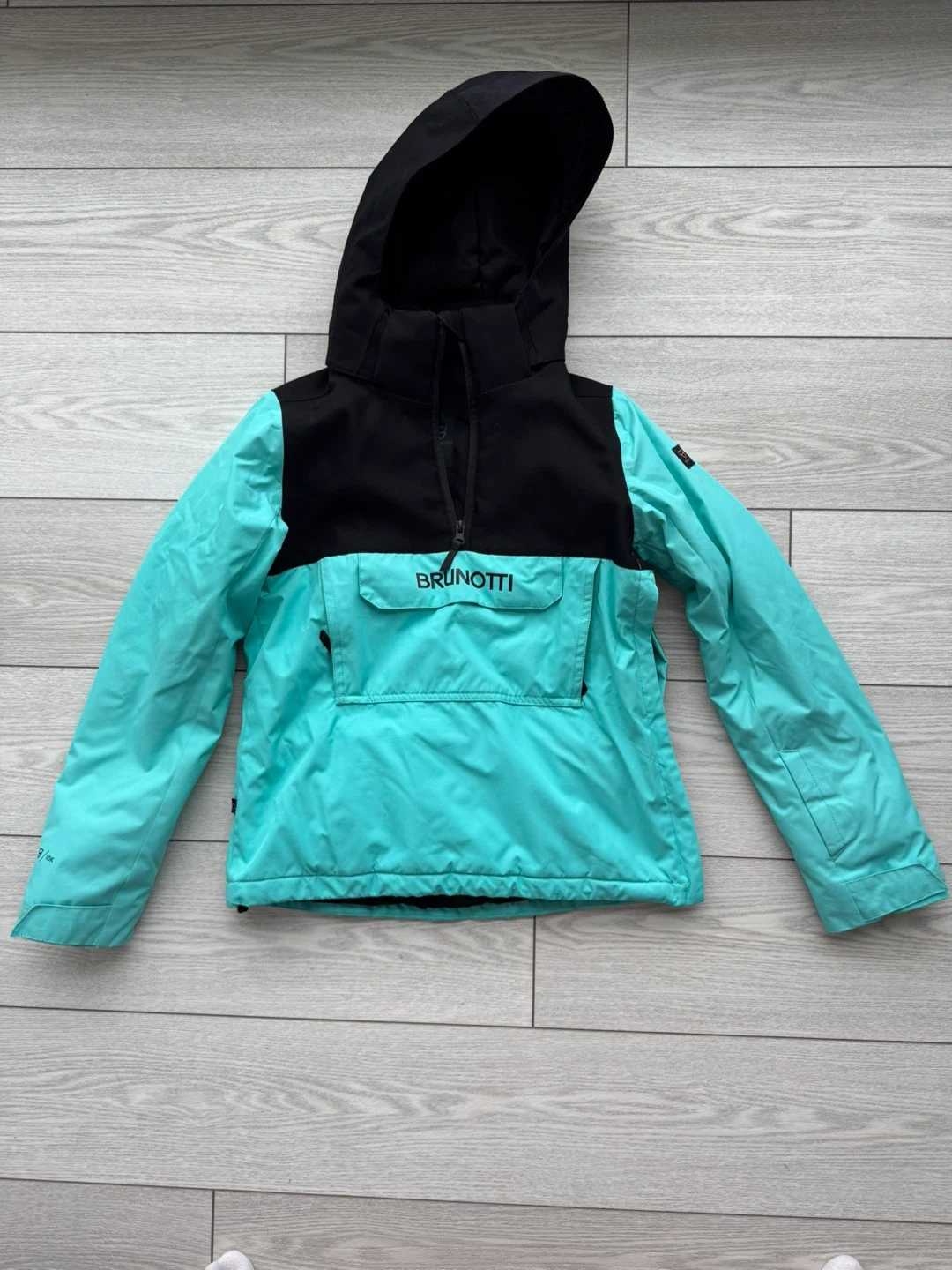This is a blue and black Brunotti ski jacket. It features a front pouch pocket and a hood. Perfect for hitting the slopes!