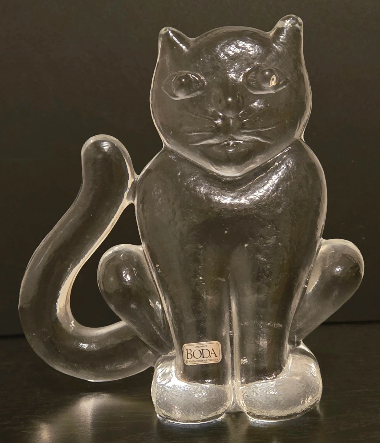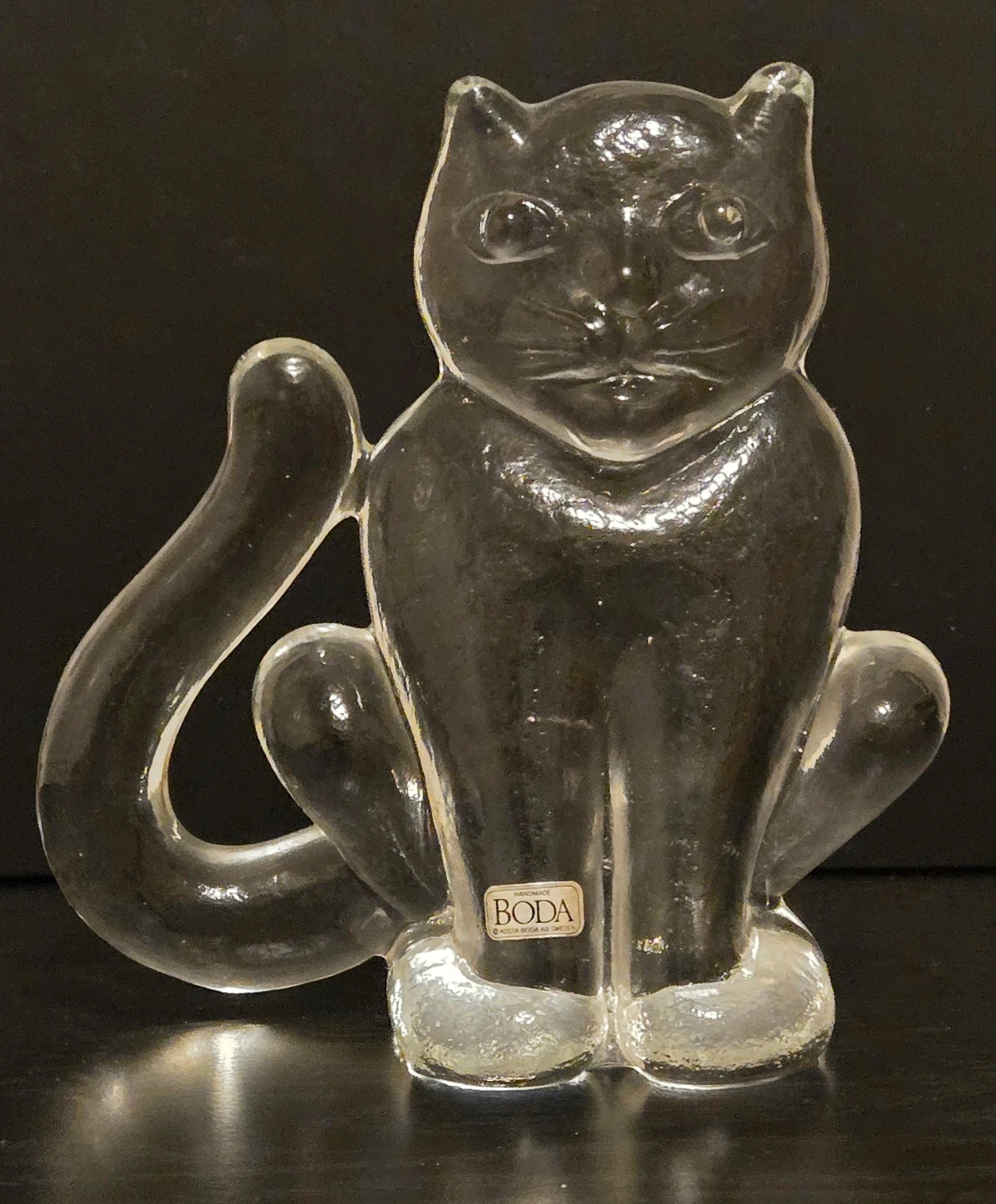 Vintage 1970's Kosta Boda Exquisite Art Glass Crystal. Part of the Zoo series designed by Swedish artist Berti Vallien. Still has Original Boda Label. Like New Condition. Textured Glass Front. There Were 2 Sizes for this Cat, Small and Large. This is the Large at 5 3/4" Height.