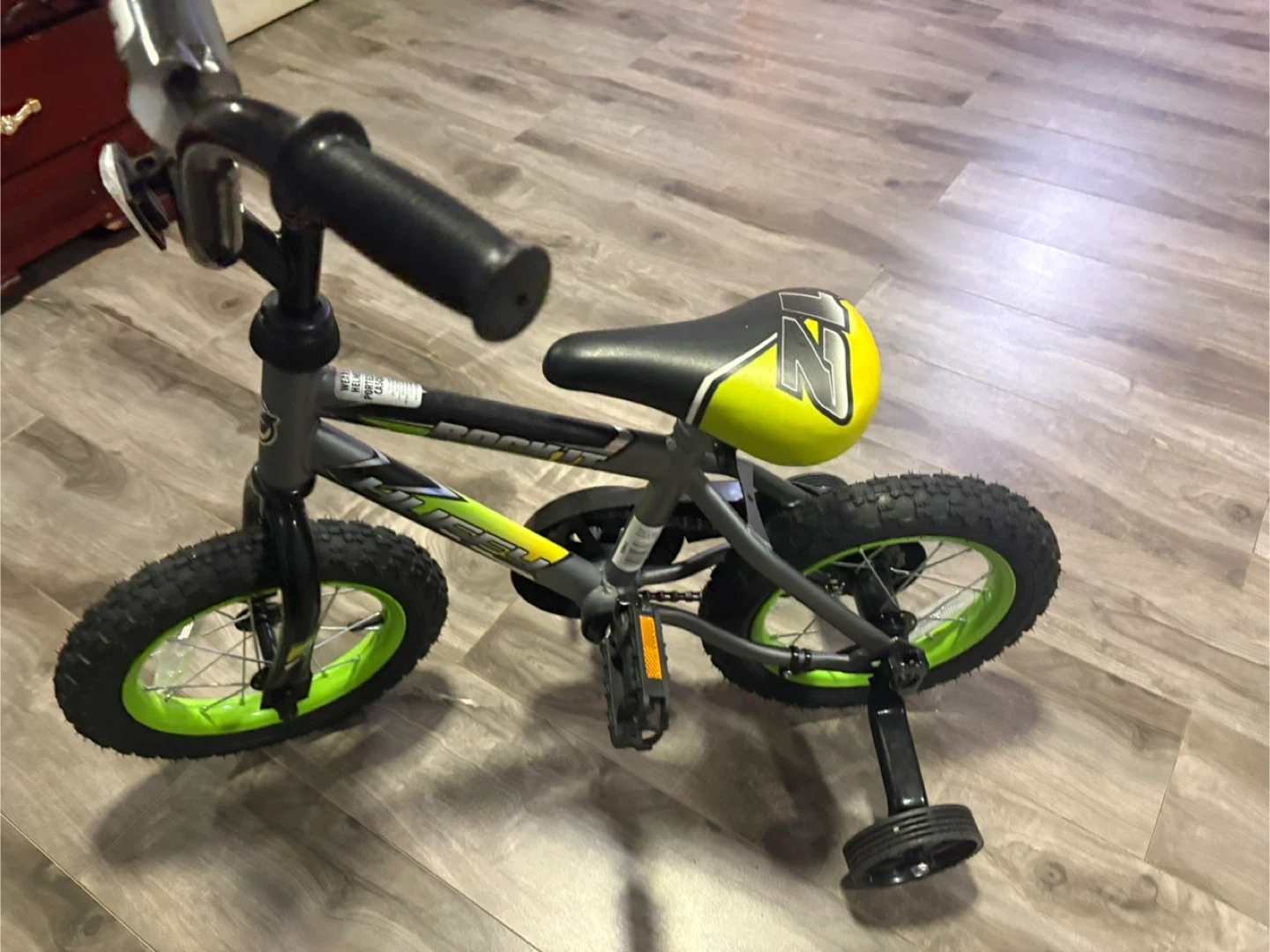 This Huffy Rock It kids bike features a cool grey and neon green design. It comes with training wheels, making it a great starter bike for young riders. Durable construction for many adventures!