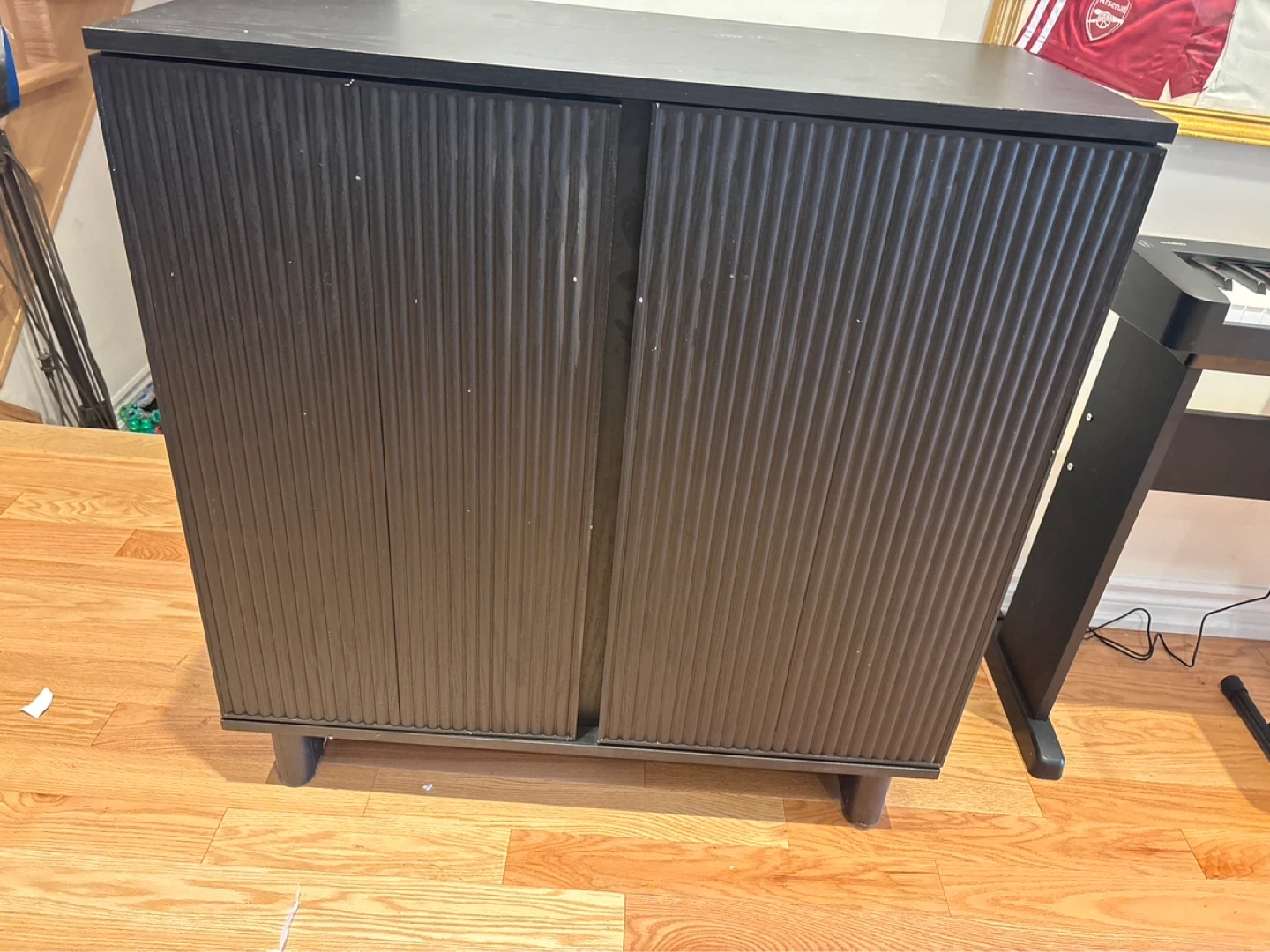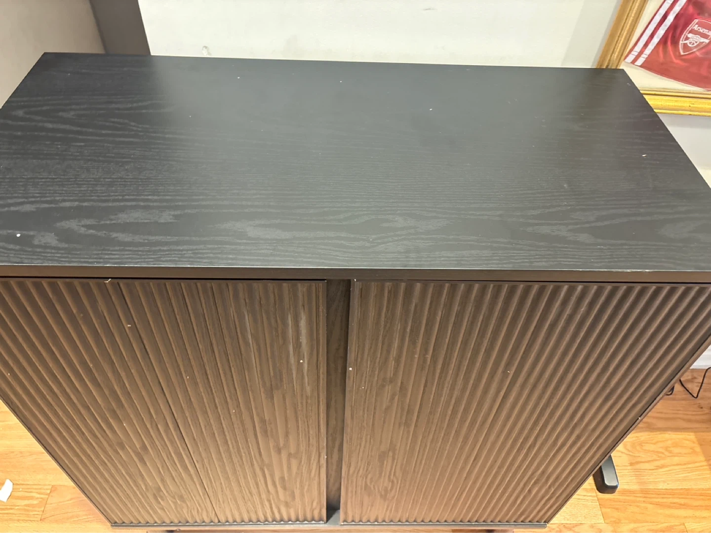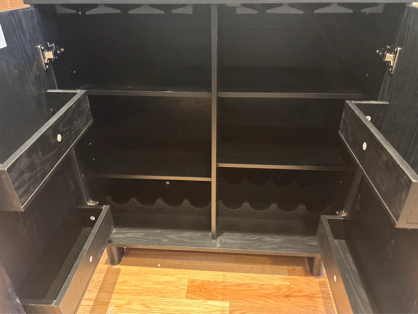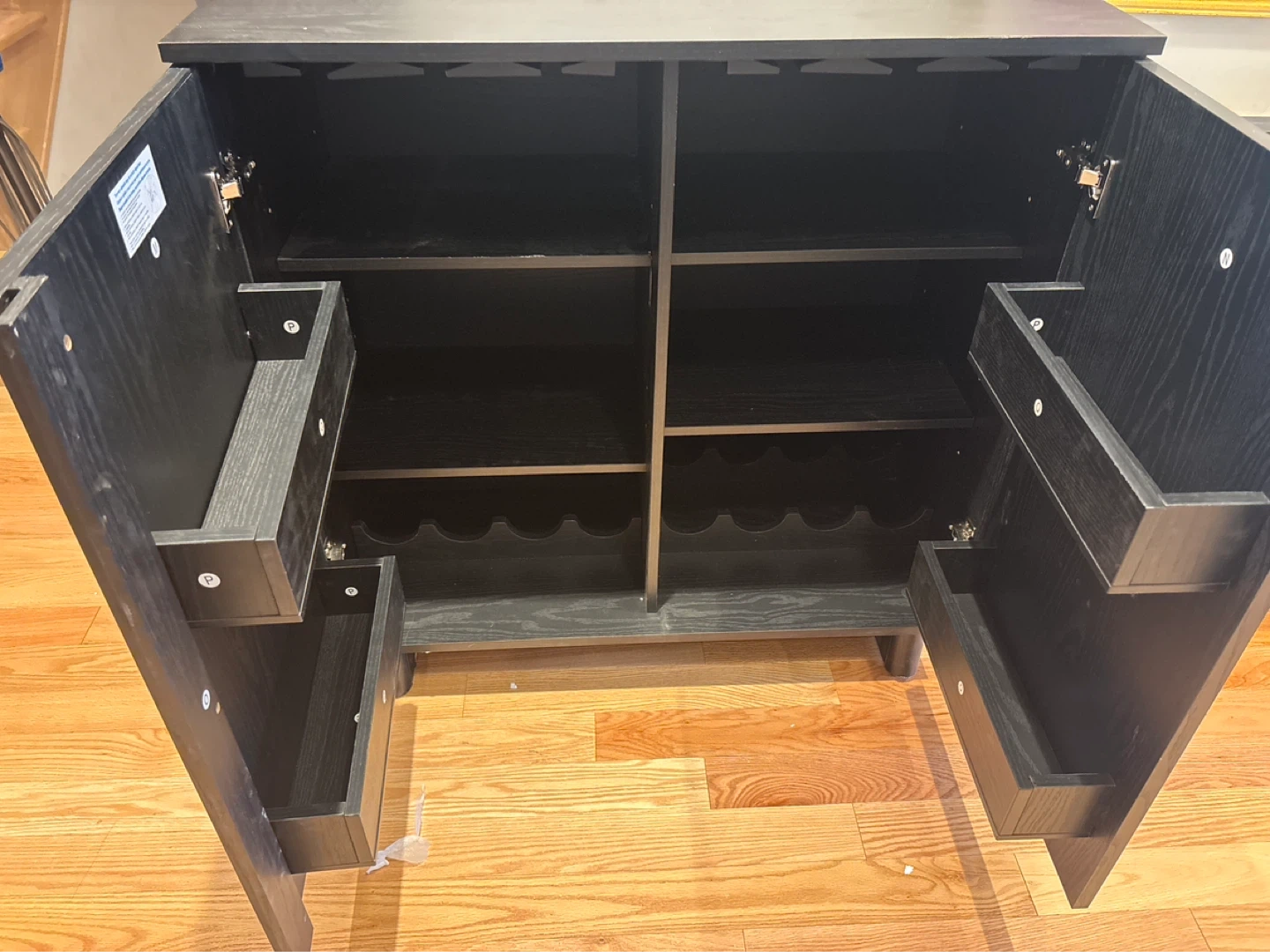 This bar cabinet is black with fluted doors. It features interior shelving and wine bottle / glass cup racks. It's a great storage solution for drinks!