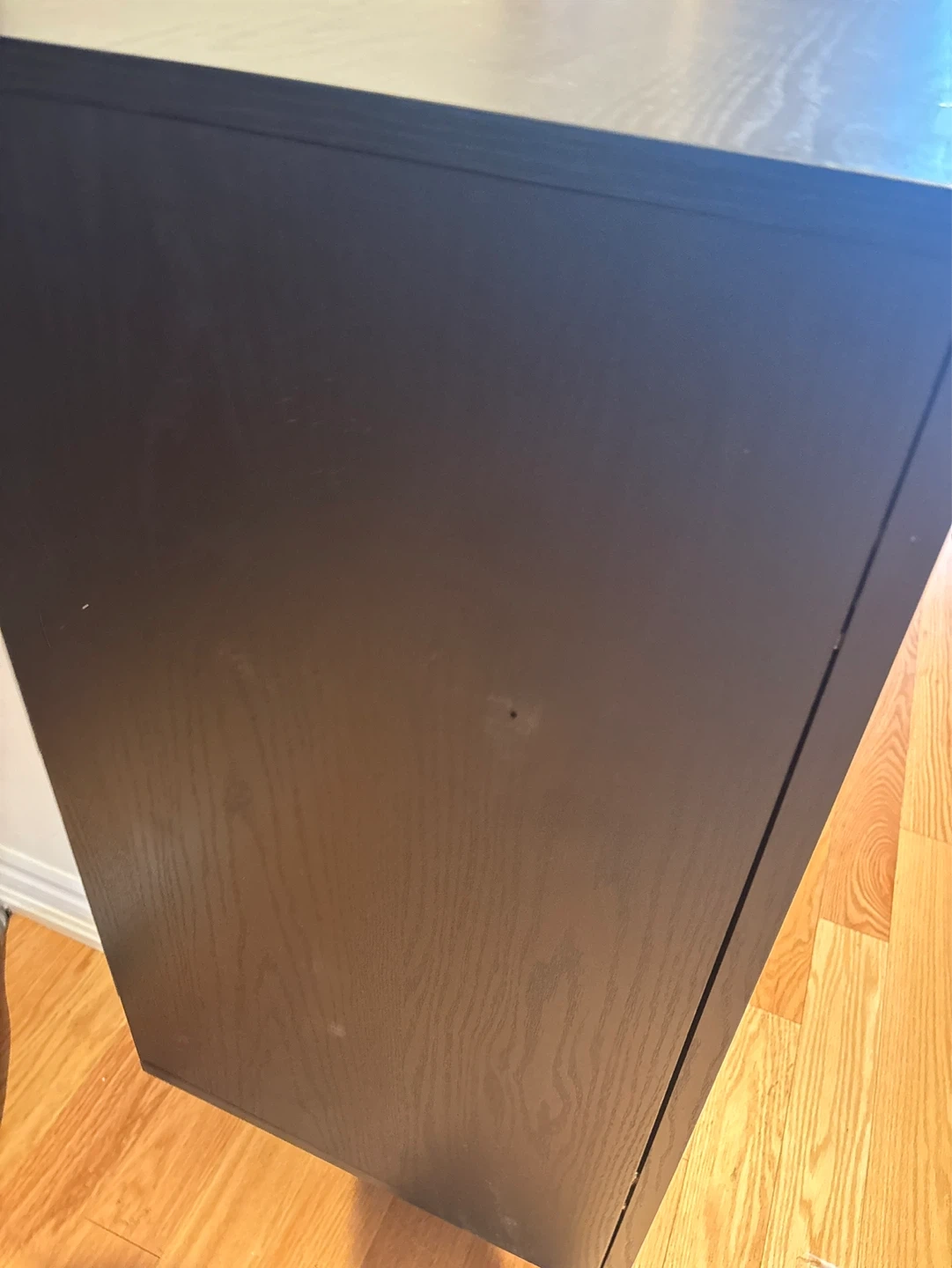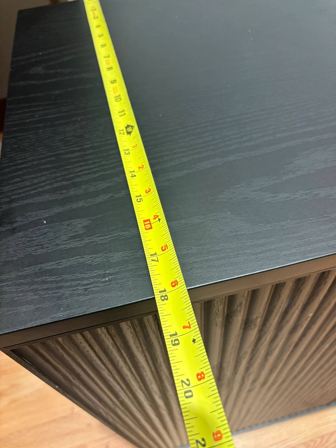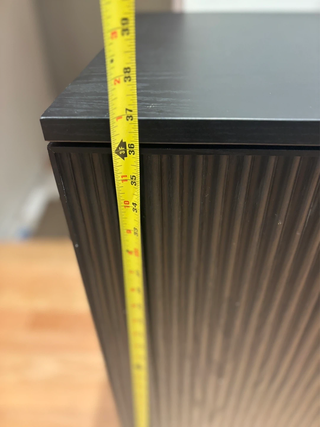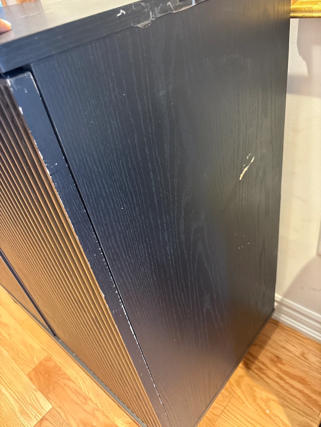 This bar cabinet is black with fluted doors. It features interior shelving and wine bottle / glass cup racks. It's a great storage solution for drinks!