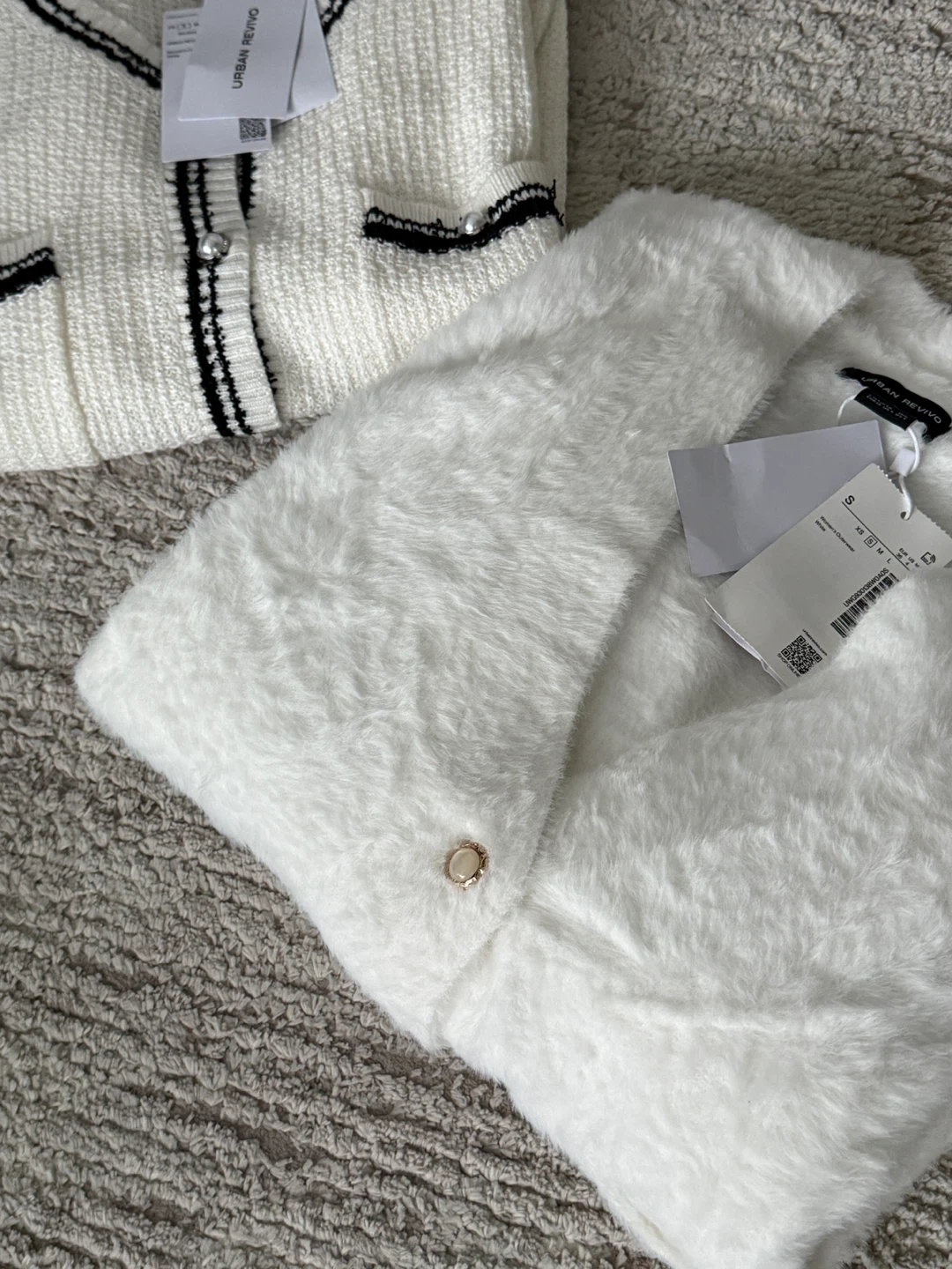 S and the other is a fluffy white cardigan, size S. Both are super cute with tags still attached