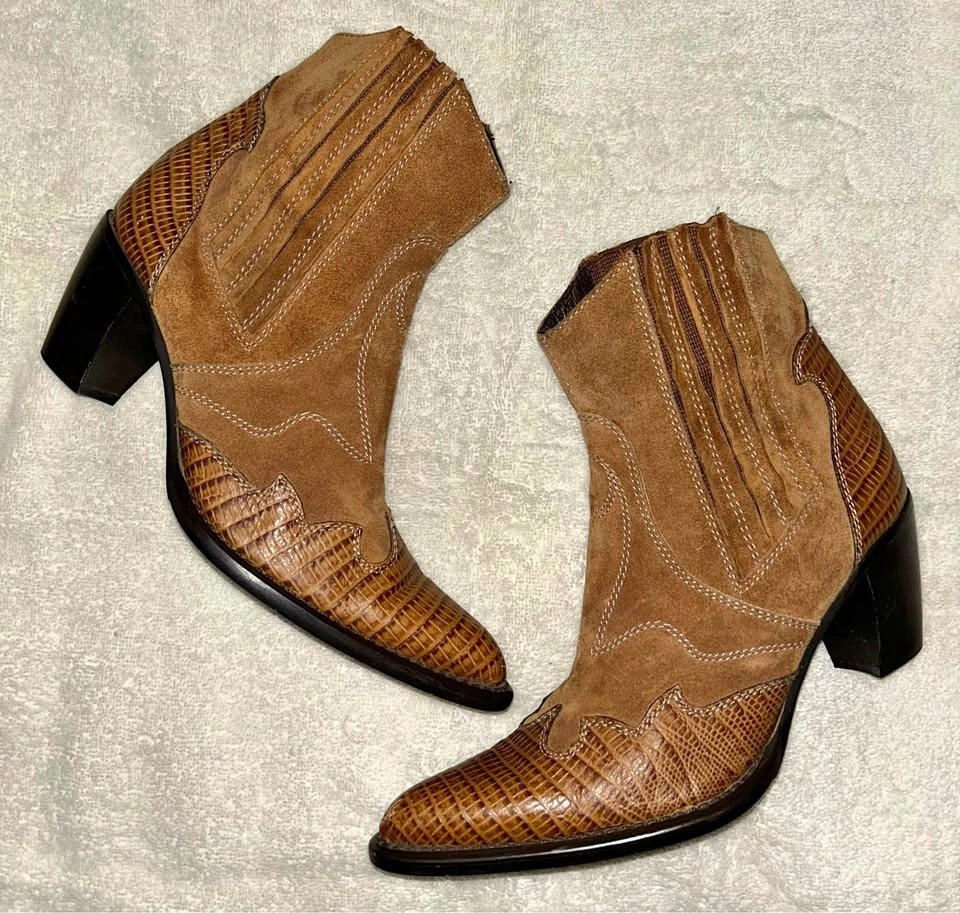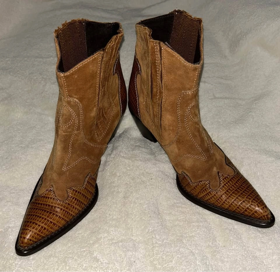 Gorgeous pair of brown leather and suede Barneys New York vintage short, fashion cowboy boots with a pointed toe. Size 37 (6.5-7). Excellent condition, barely worn. Pick up from the upper west side of Manhattan.