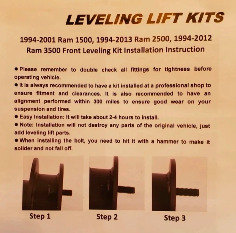 This is a front leveling lift kit for Ram trucks. It's designed for models 1994-2001 Ram 1500, 1994-2013 Ram 2500, and 1994-2012 Ram 3500. The kit includes the lift components and bolts. Installation typically takes 2-4 hours and doesn't alter the original vehicle parts.
