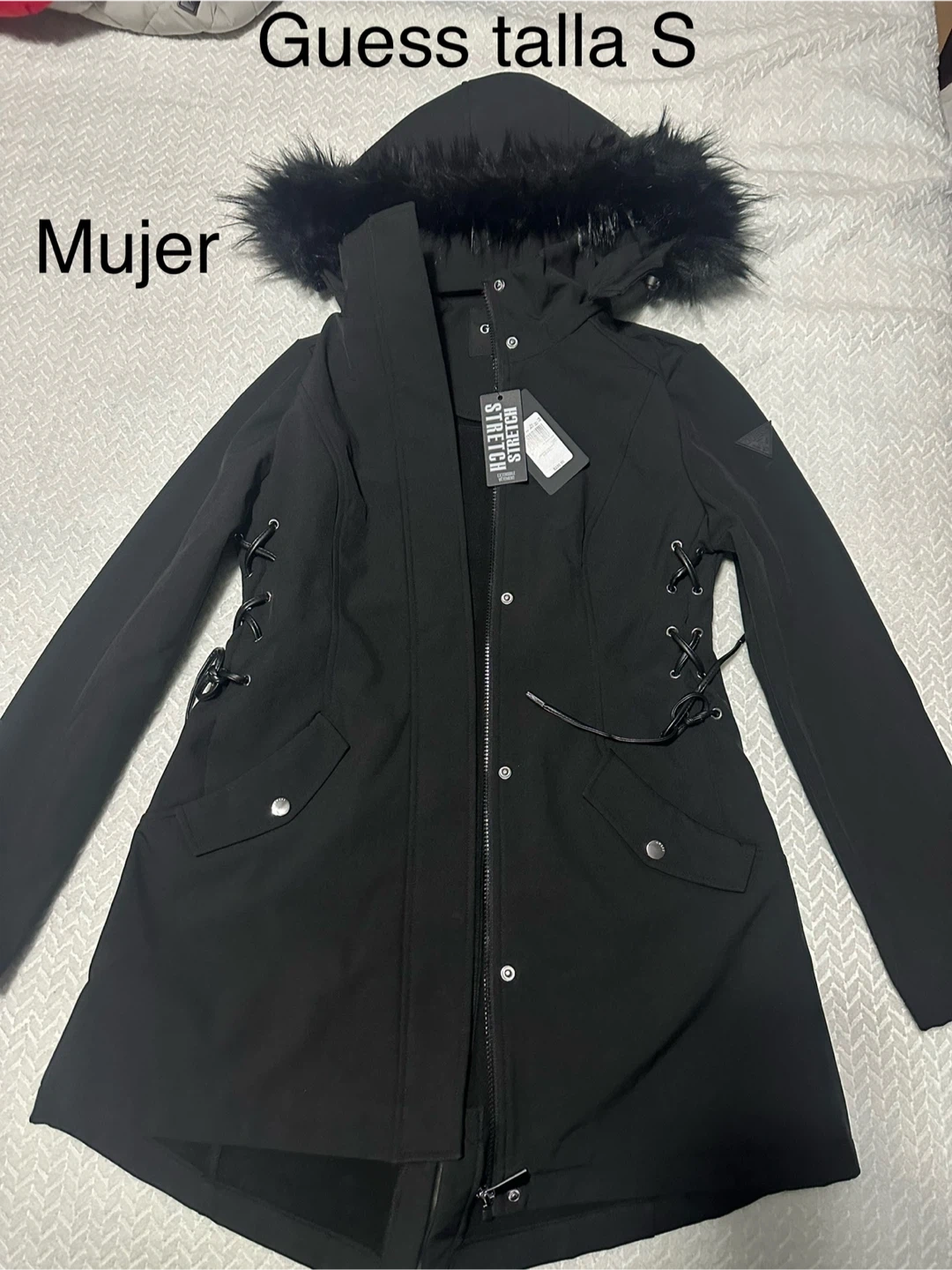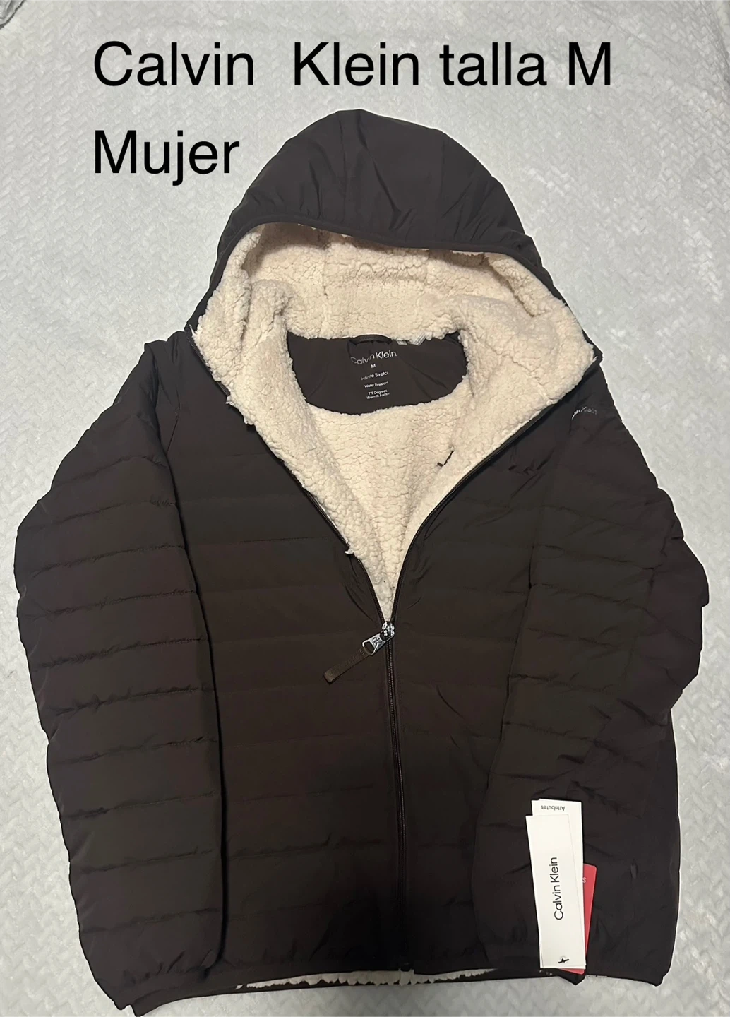 I'm selling a stylish Calvin Klein puffer coat in a lovely red color! It's a women's size L and features a cozy hood, perfect for staying warm during chilly days. The quilted design adds a touch of elegance, making it a versatile addition to your wardrobe