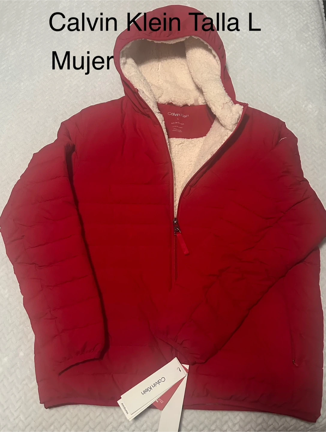 I'm selling a stylish Calvin Klein puffer coat in a lovely red color! It's a women's size L and features a cozy hood, perfect for staying warm during chilly days. The quilted design adds a touch of elegance, making it a versatile addition to your wardrobe