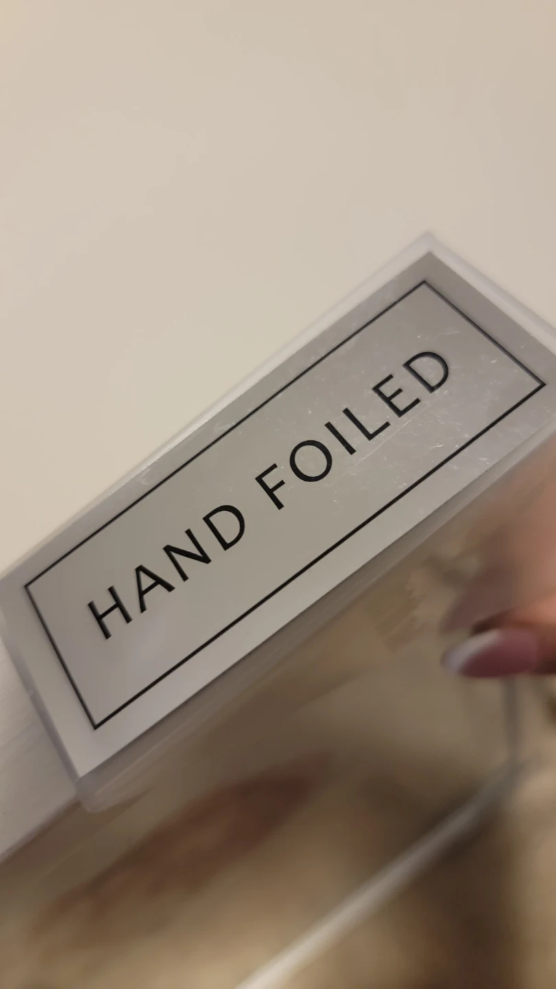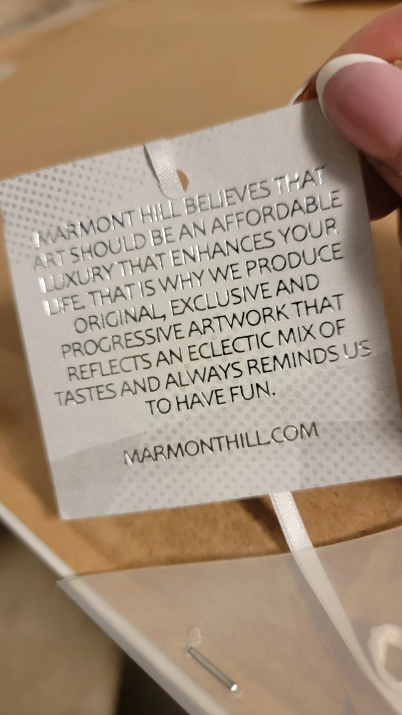 This framed wall art features a 'Paris Eau de Parfum' graphic with floral accents. It's a hand-foiled piece by Marmont Hill. The artwork is presented in a white frame.
