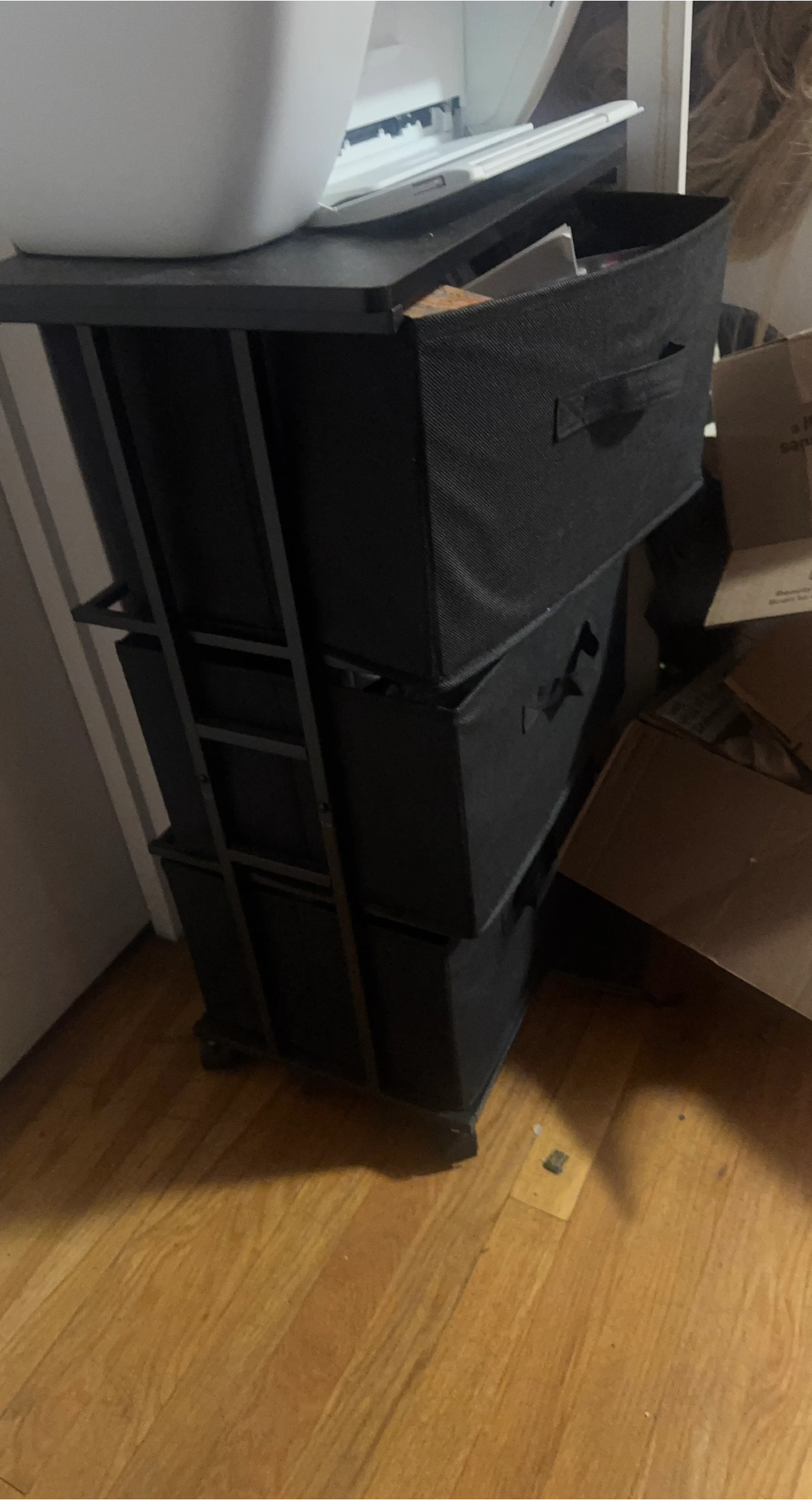 Black 3-tier storage cart on wheels. Includes three black fabric storage bins with handles. Perfect for organizing various items around your home. Cart frame is metal.