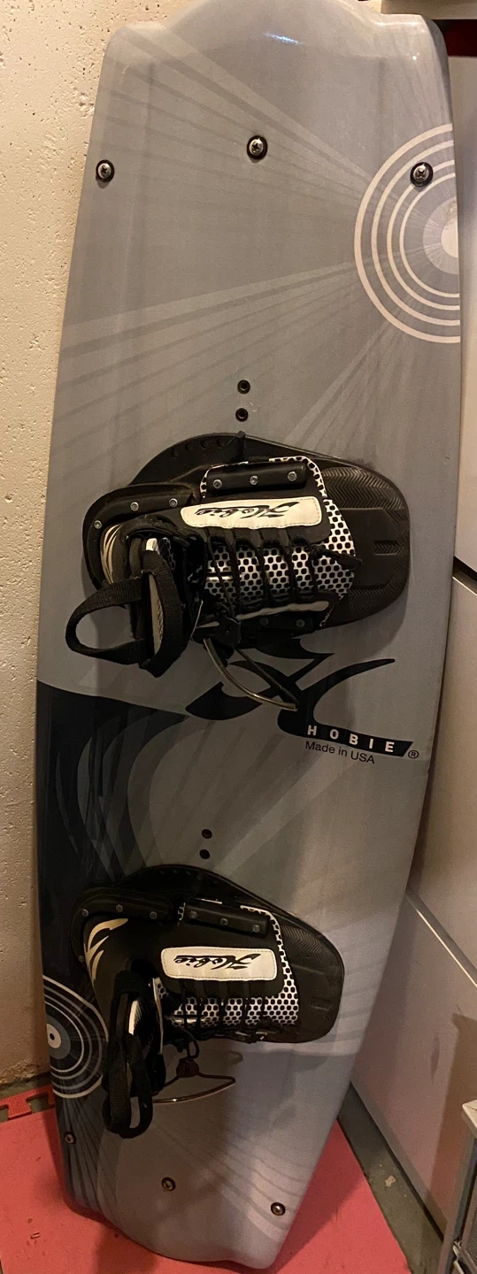 Selling a Hobie wakeboard that's ready for the water! It comes with bindings so you're all set to go. The board has a cool grey and black design. Perfect for some fun on the lake!