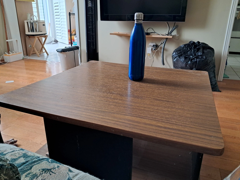 Selling a coffee table with a wood top and black base. It's in good condition and would look great in any living room