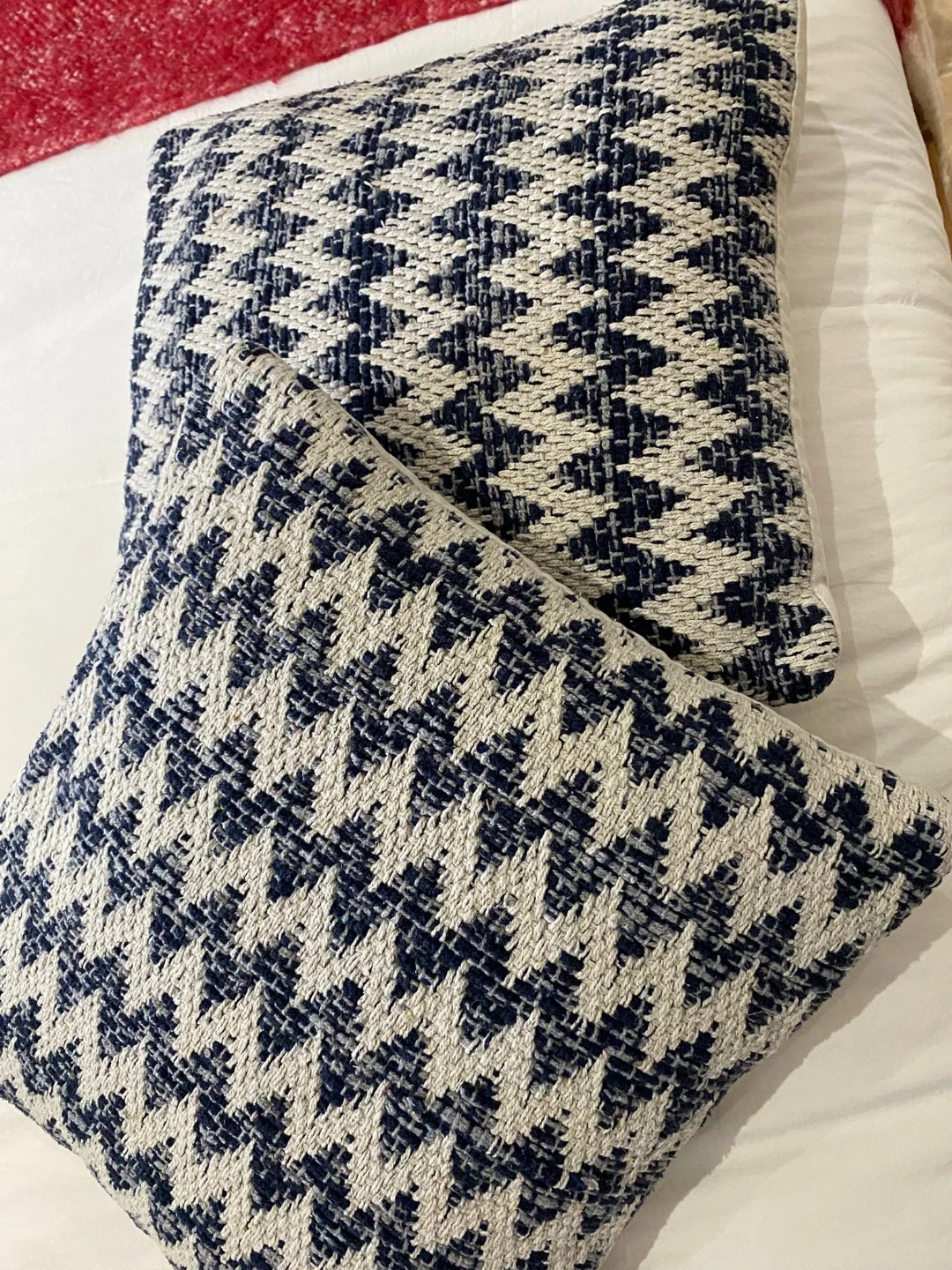 Two beautiful decorative cushions with a classic geometric print in navy and white. Perfect for adding a touch of style to any bed, sofa, or chair! The fabric appears to be a durable, textured weave. The covers are removable for easy cleaning. Smoke-free, pet-free, and sanitized.