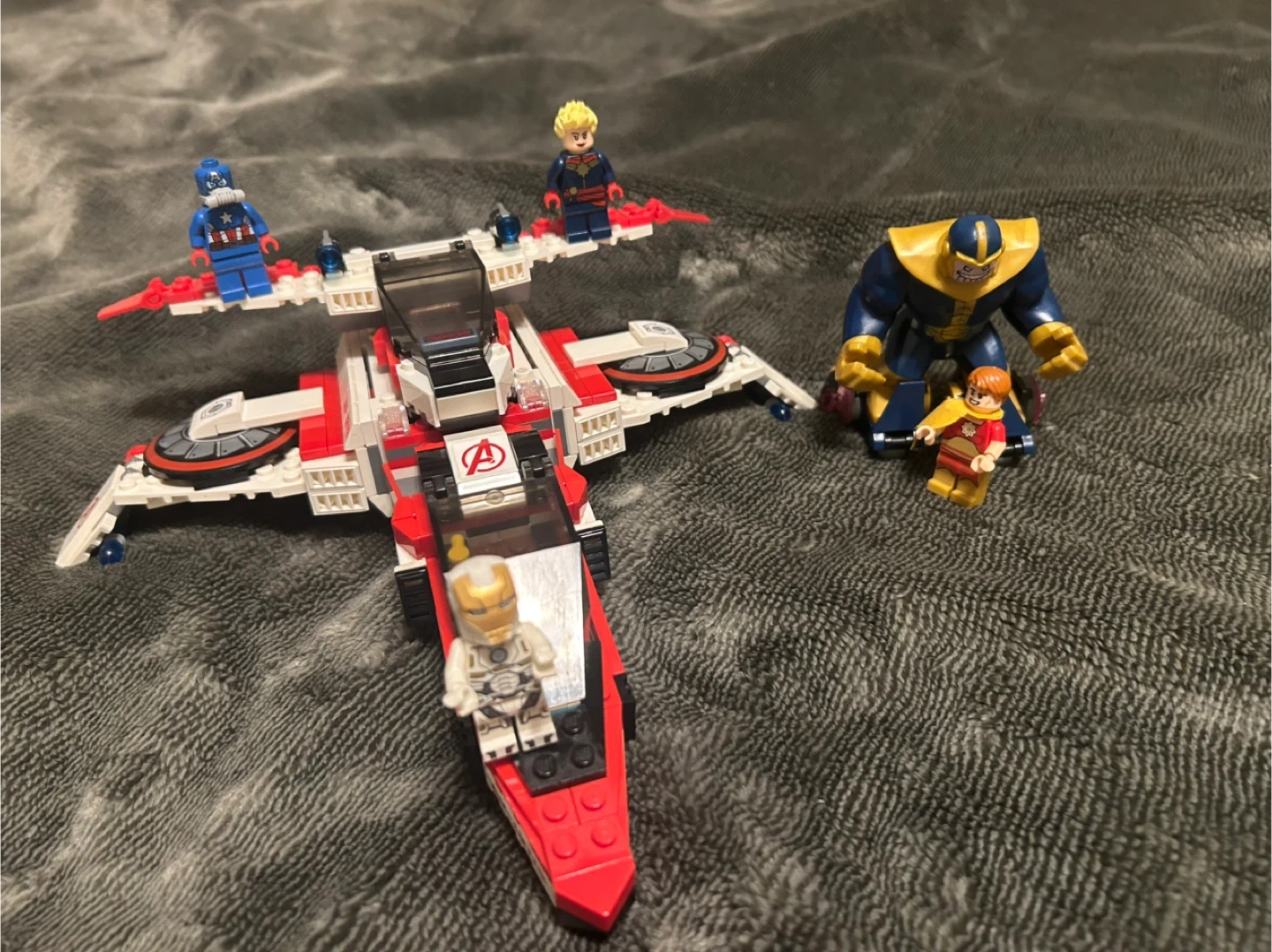 This LEGO set features the Quinjet with minifigures of Iron Man, Captain America, Thor, and Hawkeye. It also includes Thanos and a smaller figure. Pieces are primarily red, white, and grey. Box is included