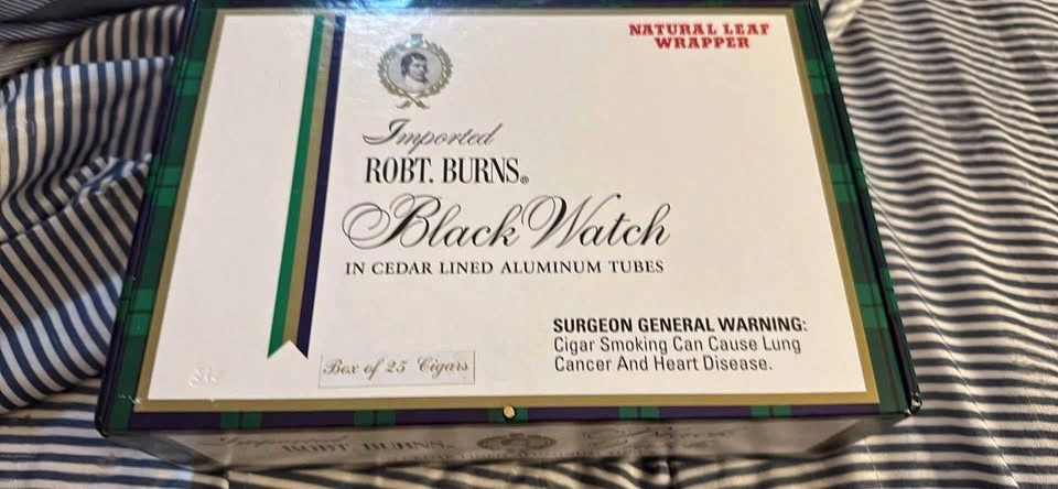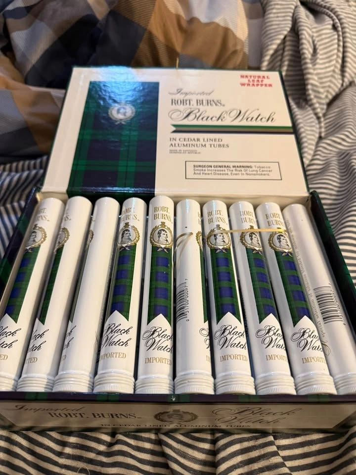 Inherited an unopened box of Robbie Burns Black Watch Cedar Lined tubed cigars. I've put them in a humidor until sale. The empty tubes themselves sell for $10-20. Or could be a memory keepsake after you smoke it! It would be cool for folks to crack these open to celebrate!