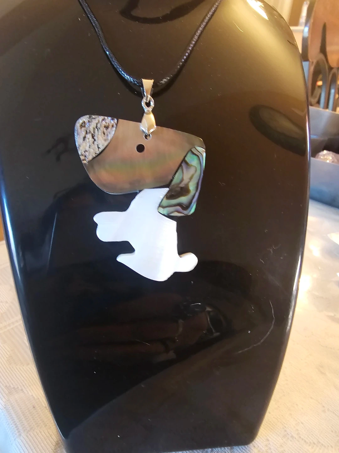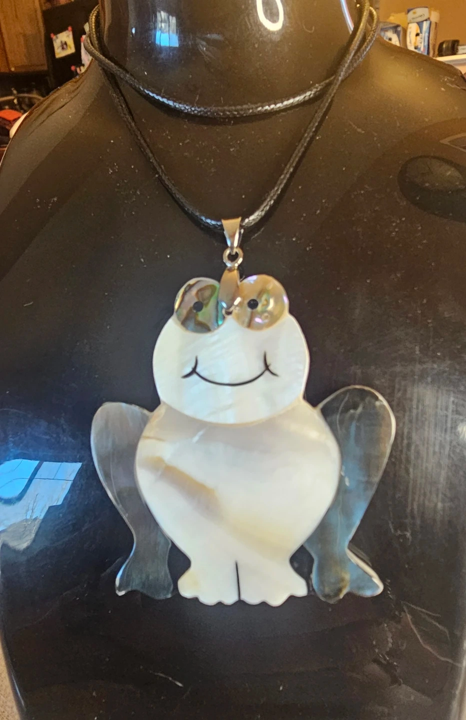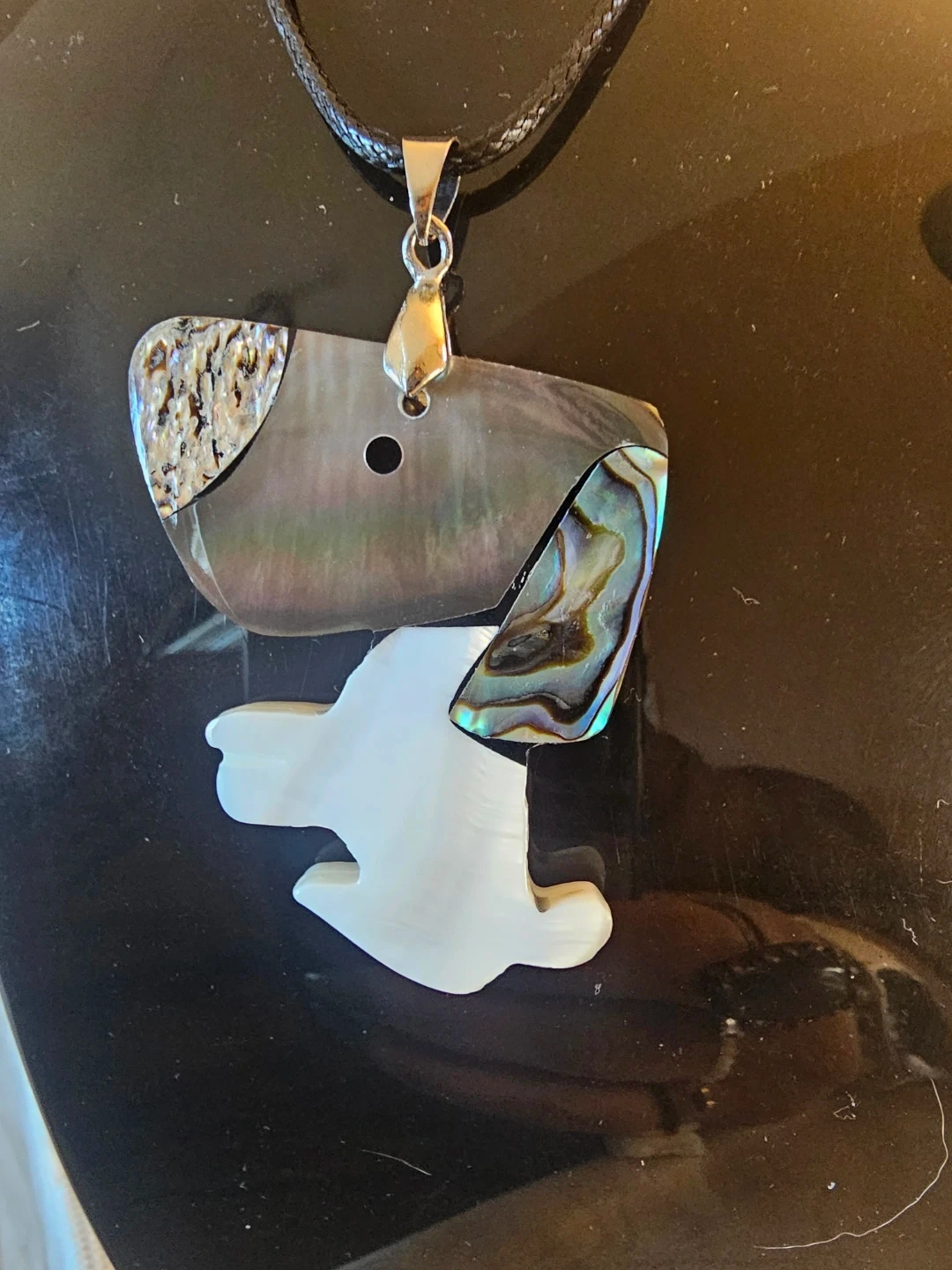This fun pendant features a smiling frog and puppy design, crafted from polished mother of pearl and iridescent abalone shell. It hangs from a black braided cord necklace. A unique piece for any jewelry lover!
