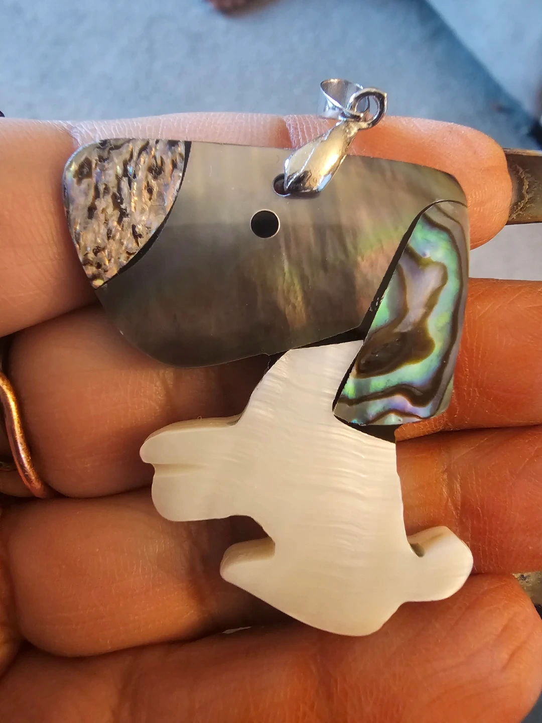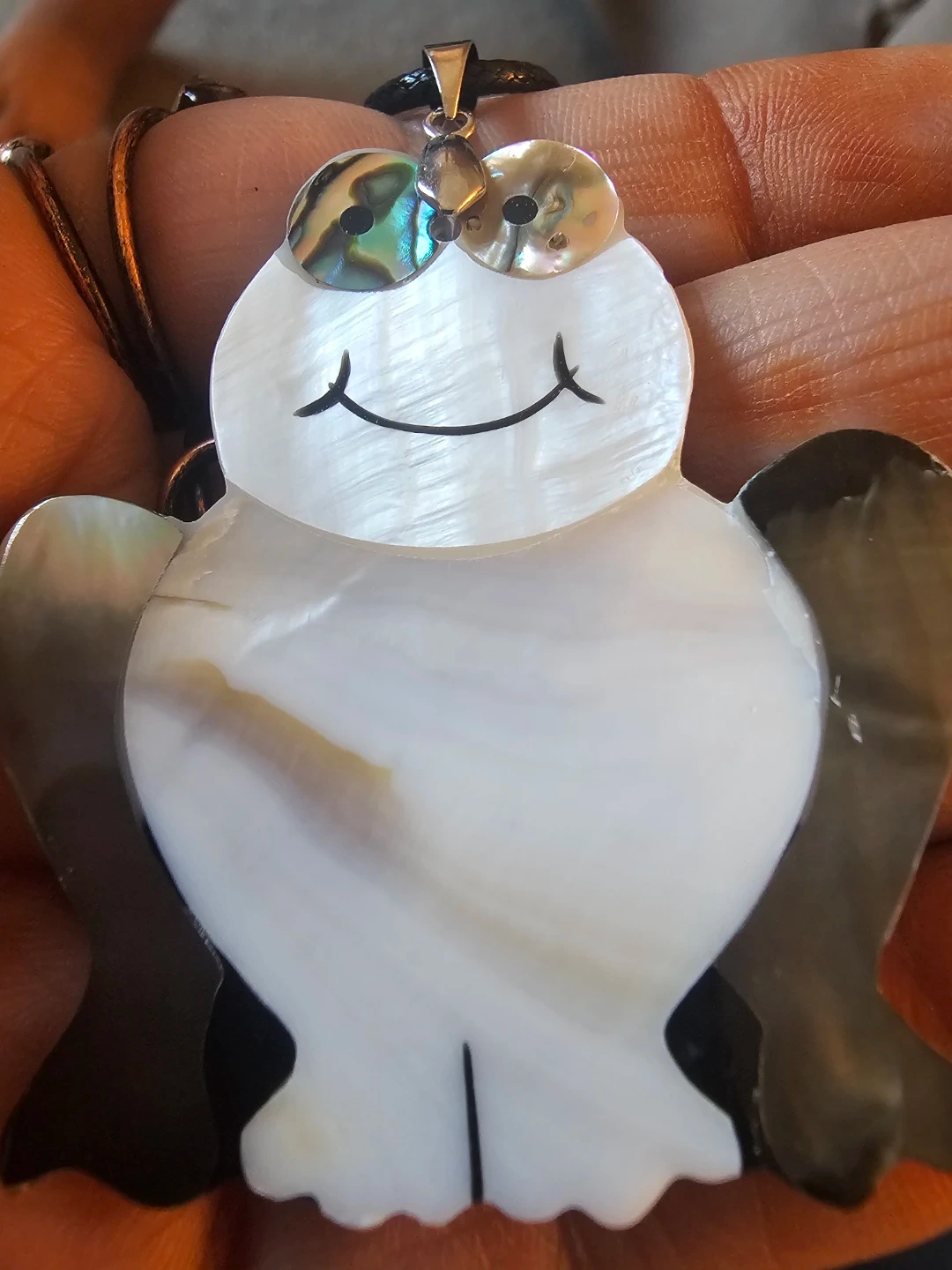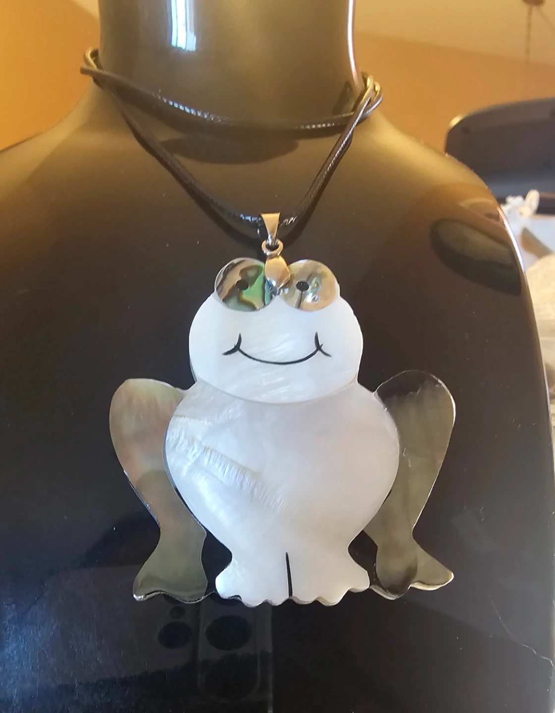 This fun pendant features a smiling frog and puppy design, crafted from polished mother of pearl and iridescent abalone shell. It hangs from a black braided cord necklace. A unique piece for any jewelry lover!