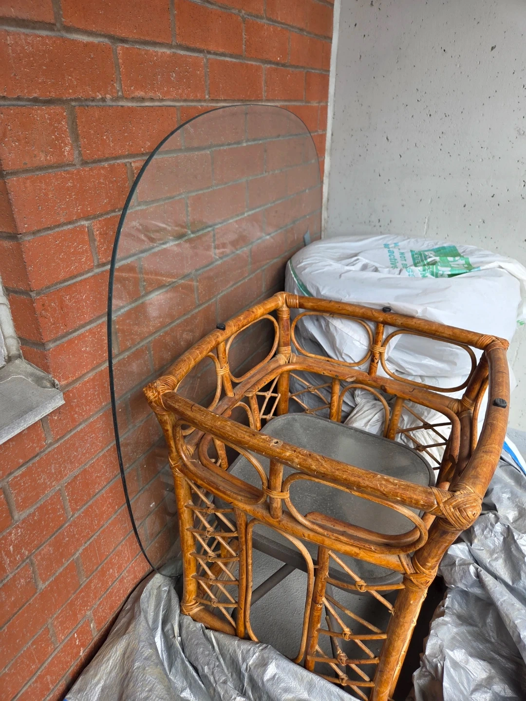 Round glass table top with a woven rattan pedestal base. The pedestal is not new and needs a little work. However it is steady and works with the glass top. The top is oval shaped around 46" diameter. It is too large for my small balcony and need it gone soon as we are finally getting to nicer weather. I have no chairs so just the top and base. It was stored all winter under a heavy tarp and the top has no scratches or chips. Pick up only in South Etobicoke (Lakeshore and 4th St).