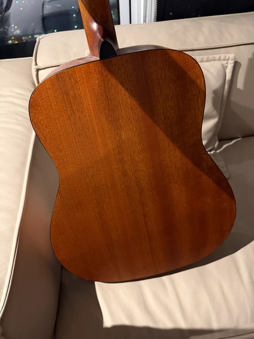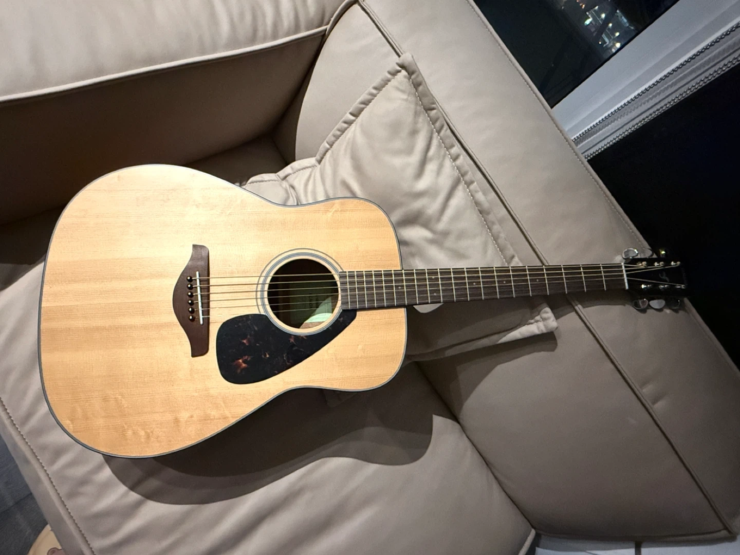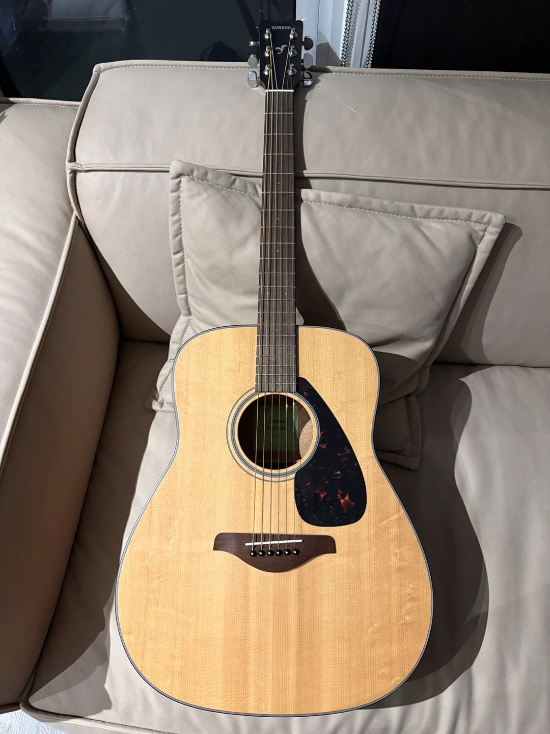 Yamaha FG800M acoustic guitar. Natural wood finish with a tortoise shell pickguard. Mahogany neck and body. Tuners are in good working order. This guitar's smaller body size makes it comfortable to play.