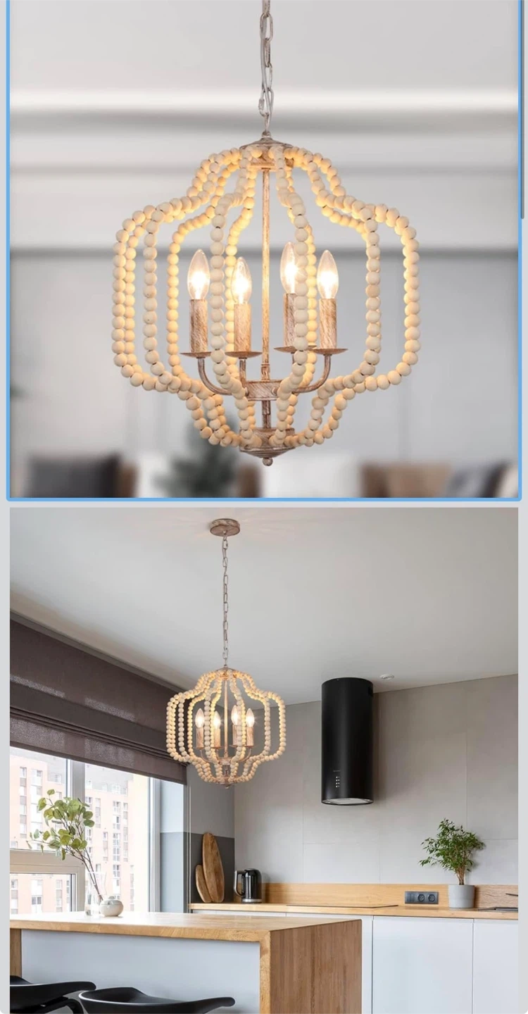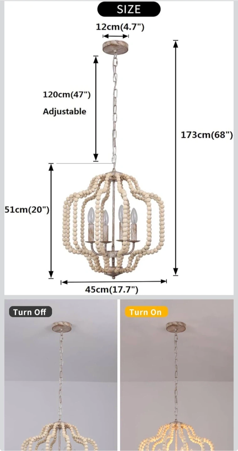 This beaded chandelier adds a rustic charm to your space. It's a 4-light fixture with an adjustable chain. The canopy measures 12cm (4.7"). The fixture is 51cm (20") high and 45cm (17.7") wide. This light would be nice in a dining room or entryway!