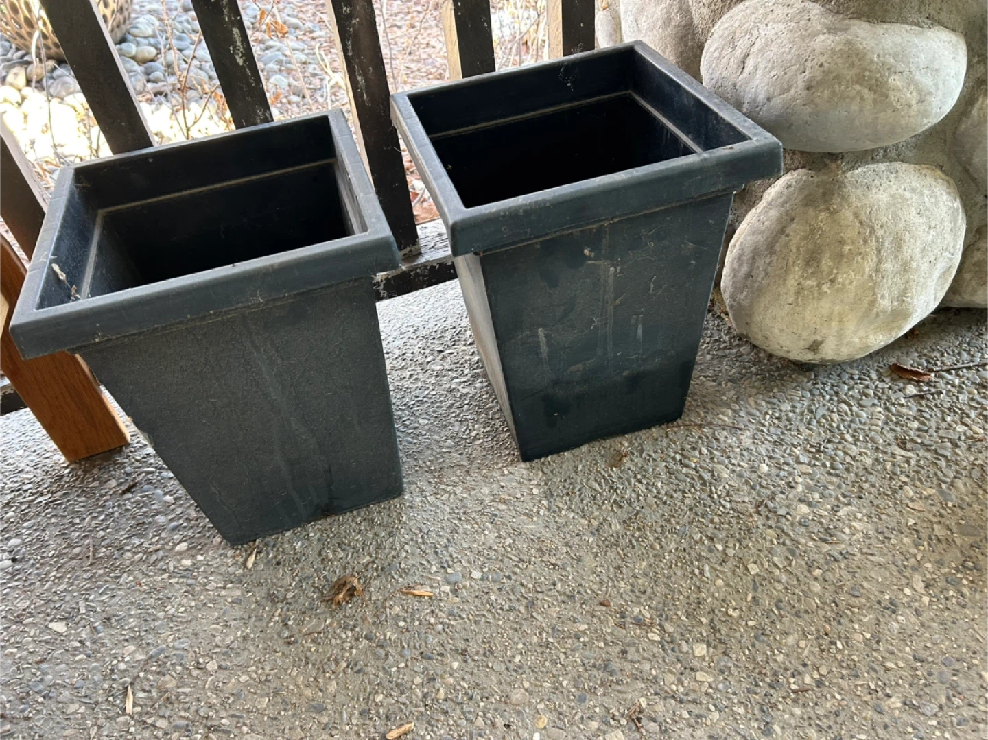 Selling a set of two black, square plastic flower pots. They're perfect for adding some greenery to your balcony or garden. They are in good condition and ready for your favourite plants