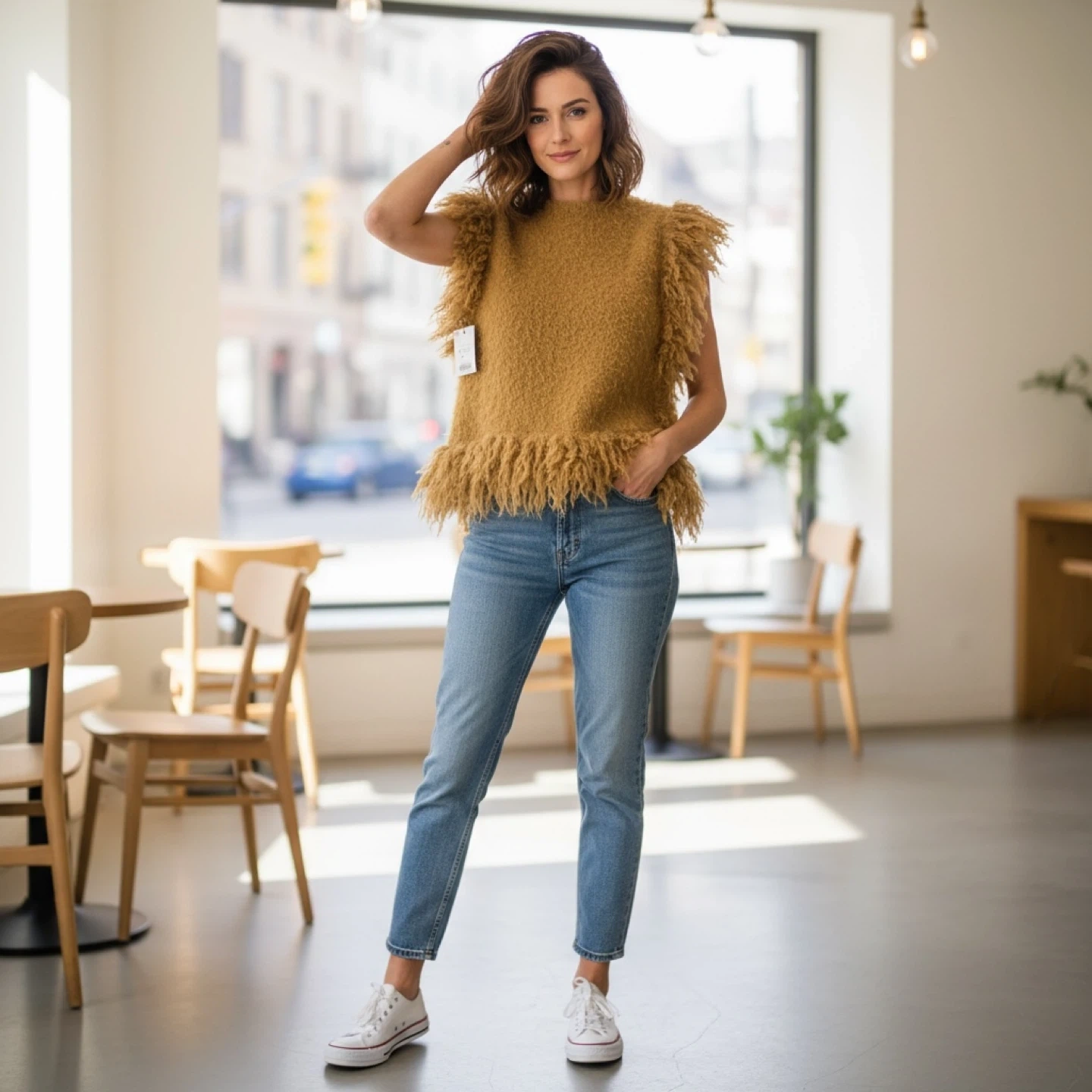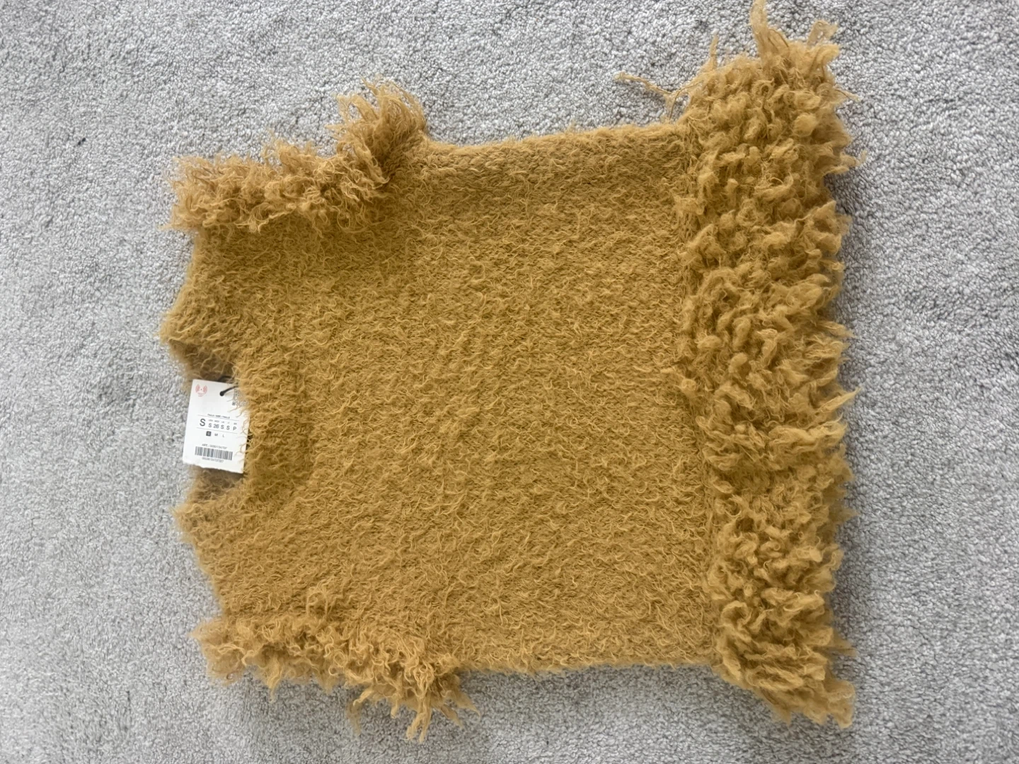 This is a tan, sleeveless knit vest with faux fur trim and fringe detailing. It has a crew neckline and a relaxed fit. Made with a soft textured yarn. Size is small.