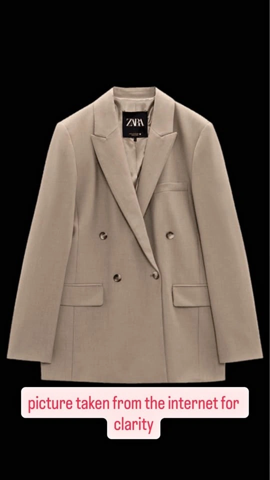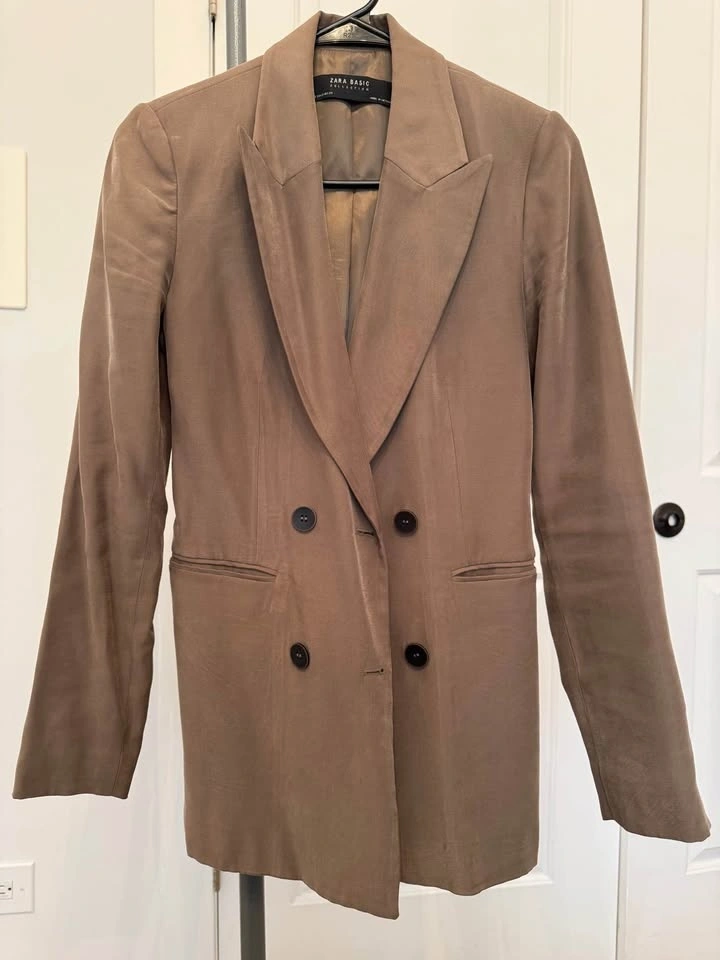 Classic tailored ZARA blazer in a versatile taupe/ mocha shade. Fully lined, double-breasted style with structured shoulders-perfect for office, meetings or smart casual looks. Size XS. Great condition (no stains/tears). Length 27".
