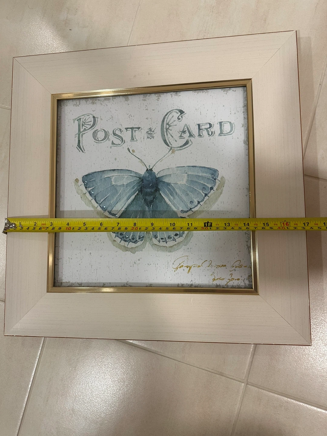 Cream coloured frame with a brass inlay around the artwork. Features a blue butterfly with "Postcard" text in a vintage font. Artwork is approximately 13 x 13 inches. Frame measures 16 x 16 inches.
