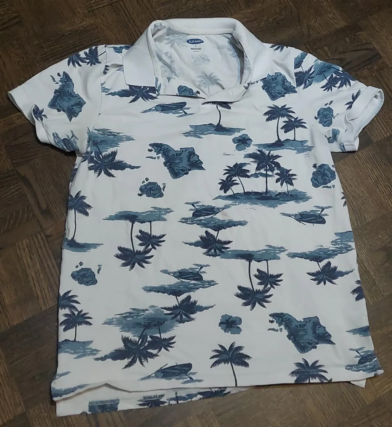 Old Navy polo shirt with a fun all-over Hawaiian island and palm tree print. It's made from a soft cotton blend for comfort. Size is medium.